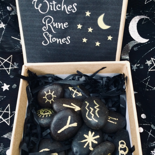 These beautiful 13 stones come in black or white with hand painted symbols on them .