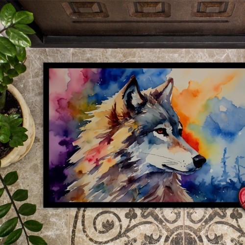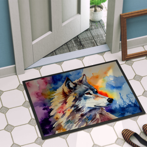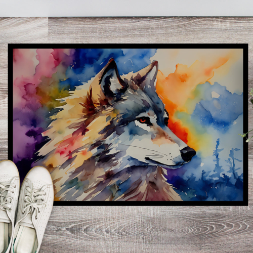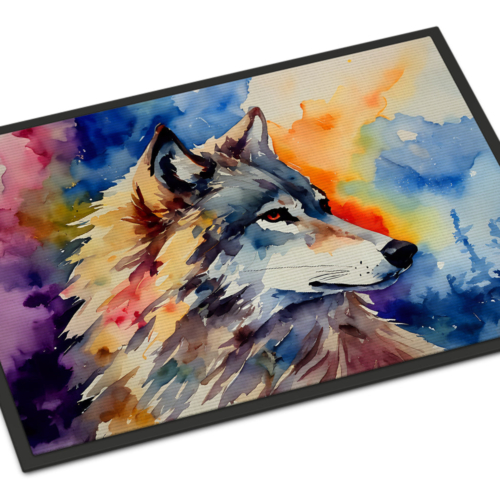 Doormat featuring breed specific Wolves artwork. Welcome your guests in style with our Artwork Door Mat, designed to withstand almost any weather condition. This mat, measuring approximately 18 by 27 inches, is held together by durable black binding tape. Its top layer, composed of polyester felt, is dyed with the eye-catching image you see on the mat. A few layers below provide the mat with stability, while its rubber bottom is stamped to help prevent slipping and ensures safety. Our mat works wonderfully as both an indoor or outdoor door mat. For cleaning, simply hose it off with water or use a power washer – no need for any cleaner that produces suds. Avoid scrubbing with a brush, instead, opt for the vacuum on floor setting. Designed manufactured and printed in the USA, this mat is a perfect addition to your porch, outdoor kitchen, entryway, or any indoor space. Its unique design makes it a charming decorative rug that greets your guests and adds a stylish touch to your home decor.