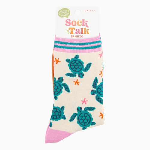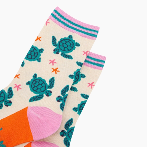 PERFECT FOR Gift for her, birthday gift, Mother’s Day, Valentine’s Day, thank you gift. THIS PIECE Crafted from naturally breathable bamboo these sea life inspired ankle socks feature swimming sea turtles and starfish. These beautiful socks are eco-conscious and feel luxuriously soft. Finished with a classic striped cuff for a comfortable fit. UK 3-7 | EU 36-40 | US 5-9 FABRIC Crafted from antibacterial, antifungal, hypoallergenic, and thermo-regulating bamboo fabric. The fabric feels soft and breathable on the skin. 56% Bamboo, 27% Polyester, 14% Cotton, 3% Spandex Made in China