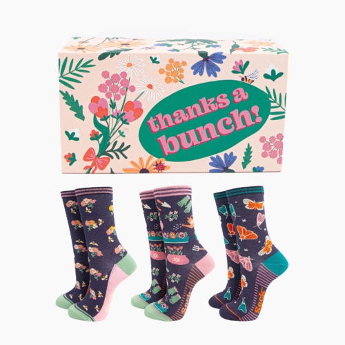 PERFECT FOR Gift for her, birthday gift, Mother’s Day, Easter gift, thank you gift, everyday wear, festival, casual wear, casual weekend, gardening. THIS PIECE This gift set includes three pairs of gardening themed ankle socks. Featuring floral posies, colourful moths and gardening tools these socks are crafted from sustainable eco-friendly bamboo. This set is presented in an artistically designed gift box. 3 Pairs of women’s ankle socks Printed gift box UK 3-7 | EU 36-40 | US 5-9 FABRIC Crafted from antibacterial, antifungal, hypoallergenic, and thermo-regulating bamboo fabric. The fabric feels soft and breathable on the skin. 56% Bamboo, 27% Polyester, 14% Cotton, 3% Spandex Made in China