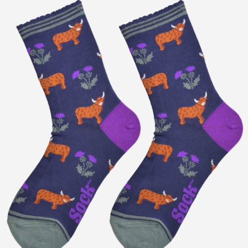 ?? PERFECT FOR Gift for her, wildelife enthusiast, everyday wear ?? THIS PIECE Soft to the touch luxury bamboo socks featuring highland cows and traditional Scottish thistles. In a classic navy blue with a contrasting purple heel and a green striped scalloped cuff. These socks are designed in the UK and crafted from soft eco-friendly bamboo. ?? FABRIC Crafted from antibacterial, antifungal, hypoallergenic, and thermo-regulating bamboo fabric. The fabric feels soft and breathable on the skin. 70% Bamboo, 27% Polyester, 3% Elastane Delicate machine wash Do not tumble dry Made in China