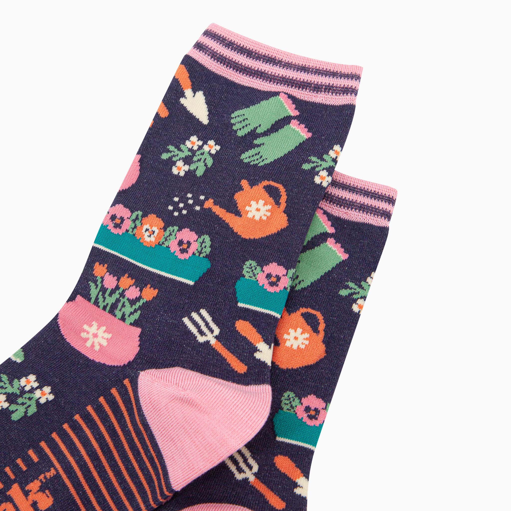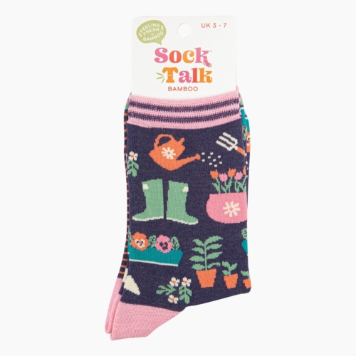 PERFECT FOR Gift for her, birthday gift, Mother’s Day, thank you gift, countryside, gardening, flowers THIS PIECE Crafted from naturally breathable bamboo these ankle socks feature an array of colourful garden tools and flowers. These beautiful socks are eco-conscious and feel luxuriously soft. Finished with a classic striped cuff for a comfortable fit. UK 3-7 | EU 36-40 | US 5-9 FABRIC Crafted from antibacterial, antifungal, hypoallergenic, and thermo-regulating bamboo fabric. The fabric feels soft and breathable on the skin. 56% Bamboo, 27% Polyester, 14% Cotton, 3% Spandex Made in China