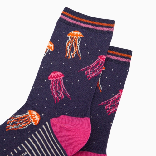 PERFECT FOR Gift for her, birthday gift, Mother’s Day, Valentine’s Day, thank you gift. THIS PIECE Crafted from naturally breathable bamboo these ankle socks showcase colourful jellyfish in their natural underwater environment. These beautiful socks are eco-conscious and feel luxuriously soft. Finished with a classic striped cuff for a comfortable fit. UK 3-7 | EU 36-40 | US 5-9 FABRIC Crafted from antibacterial, antifungal, hypoallergenic, and thermo-regulating bamboo fabric. The fabric feels soft and breathable on the skin. 56% Bamboo, 27% Polyester, 14% Cotton, 3% Spandex Made in China