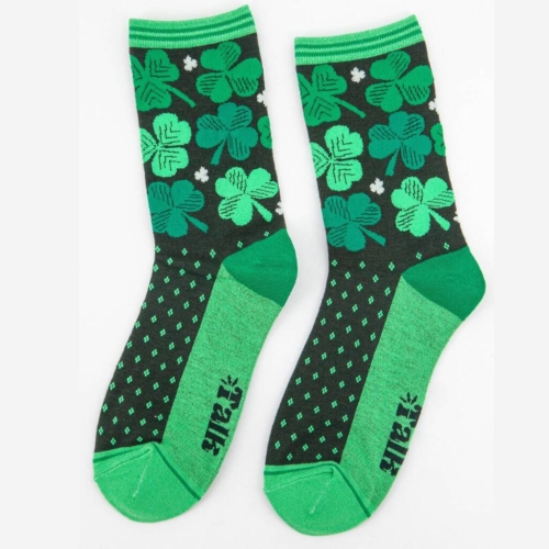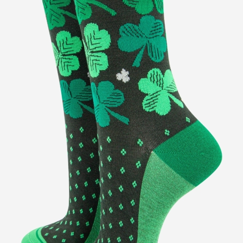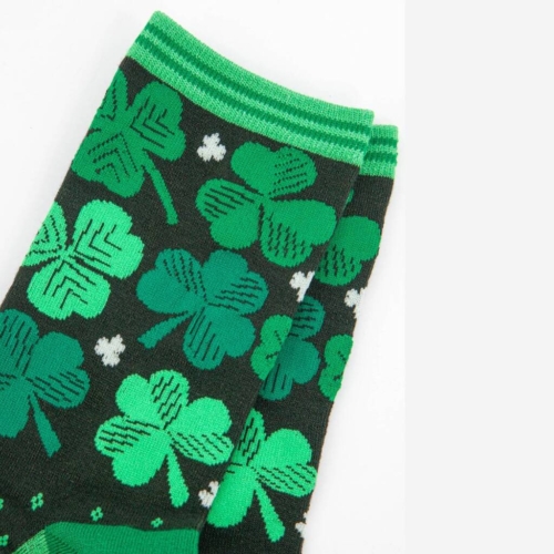 Women’s Irish shamrock and four leaf clover bamboo socks with a striped detail cuff. Women’s Irish Shamrock and Four Leaf Clover Print Bamboo Socks Anti-Bacterial & Anti-Fungal Soft & Breathable Eco-Friendly 70% Bamboo, 27% Polyester, 3% Elastane UK 3-7 | EU 36-40 | US 5-9 Machine Washable (Delicate)