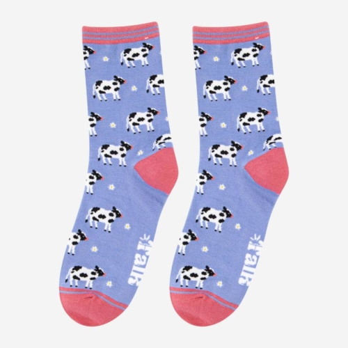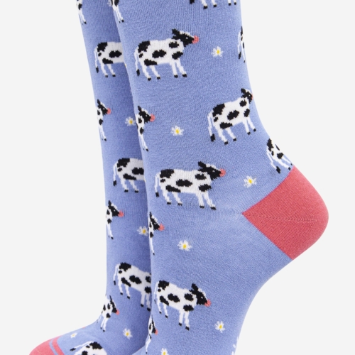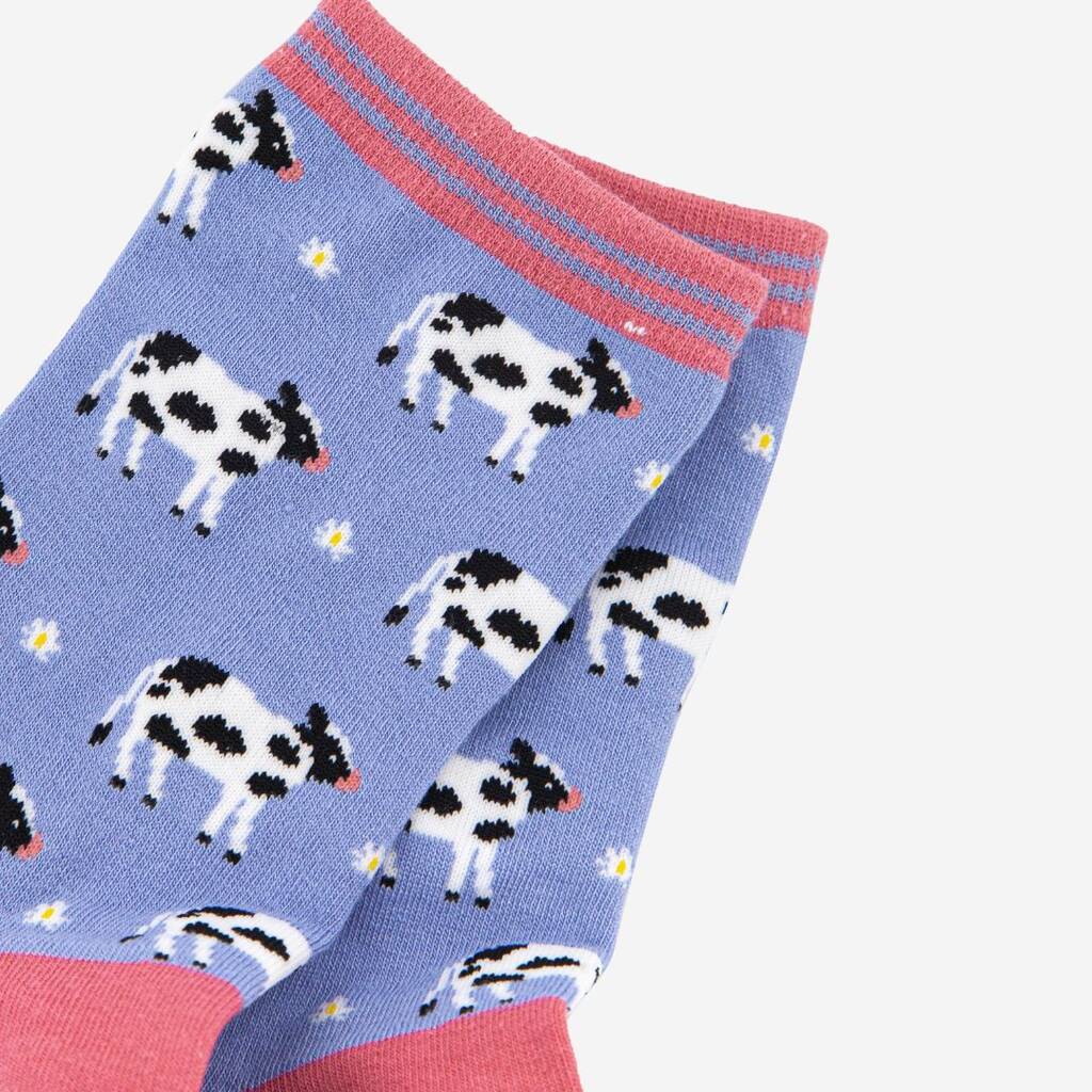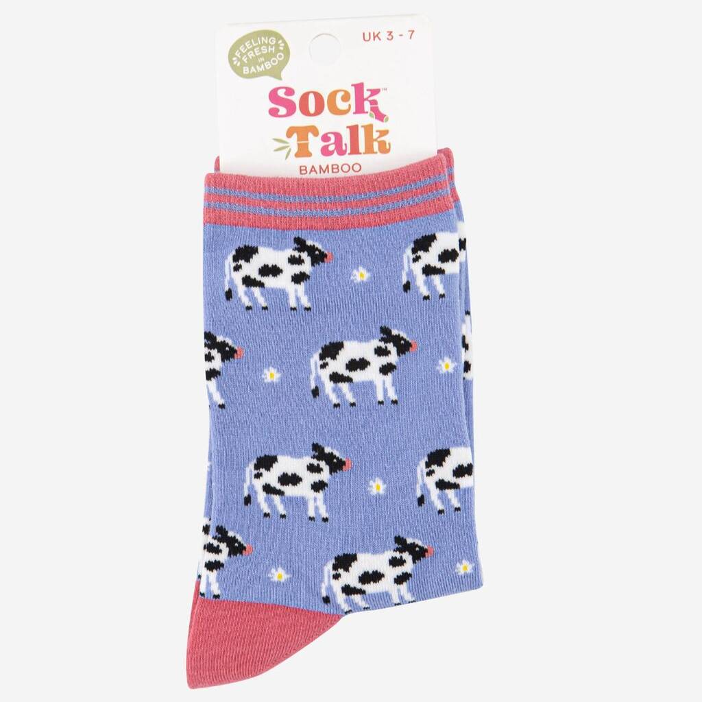 Women’s farm animal themed bamboo socks with a jersey cow and flower repeating pattern, finished with a striped cuff. Women’s Spring Cow Print Bamboo Socks Anti-Bacterial & Anti-Fungal Soft & Breathable Eco-Friendly 70% Bamboo, 27% Polyester, 3% Elastane UK 3-7 | EU 36-40 | US 5-9 Machine Washable (Delicate)