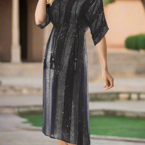 Beach Kaftan for Bathing Suit Try out our bohemian style beach cover-up dresses and kaftans. Expertly cut with a metallic sheen, this calf-length tunic is ready for you to slip on over your bathing suit. The look is cool and casually chic. Check out the wholesale collection at La Moda. Lurex Maxi Kaftan; Tunic Dress Bohemian Beach Cover Up Beachwear, Resort Wear, Cruise 100% Rayon Available In White & Black Size: S/M, L/XL Washing Instruction: Hand Wash with Cold Water, Tumble Dry, Do not Iron Material:100% RayonPack Details:6 Pcs