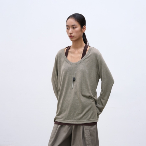 Flattering U-Neck SilhouetteThe U-neckline softens broad shoulders and refines the upper body, while the relaxed fit creates a slimming, elegant shape that complements every figure. Layered Design with Modern AppealCrafted in a chic light gray tone, this two-piece long-sleeve tee blends simplicity with depth. Its layered style offers dimension and effortless sophistication. Sustainable Comfort and VersatilityMade with recycled cotton, silk fiber, Tencel, and wool, the fabric is breathable, soft, and eco-friendly. Perfect for commuting or casual outings with timeless ease.