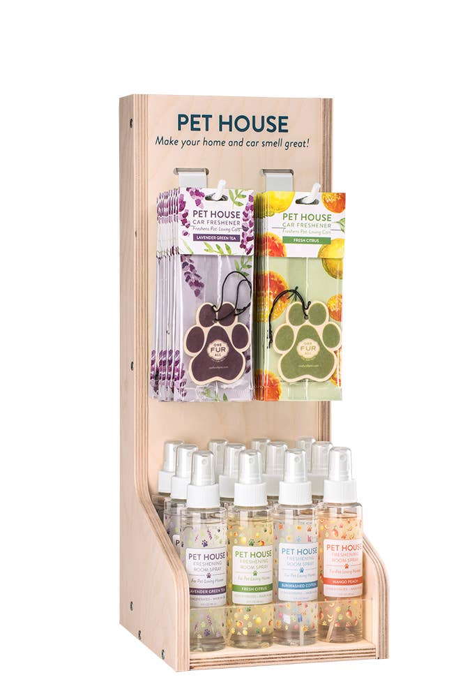 This beautiful wood display will help to quickly sell Pet House room sprays and car fresheners. The solid-wood display holds 12 room sprays and 24 car fresheners.We’ll send you this counter-top display FREE ($70 value) when you order our top selling fragrance display package that includes product to fill the display and fully restock it once.You will receive the following: 1 Counter top display (6.38″ wide x 8″ deep x 18.94″ tall) 48 car fresheners: 12 Lavender Green Tea 12 Fresh Citrus 12 Mango Peach 12 Sunwashed Cotton 24 room sprays: 6 Lavender Green Tea 6 Fresh Citrus 6 Sunwashed Cotton 6 Mango Peach All the products included in this display are:Specially formulated to freshen pet odorMade with an effective odor neutralizerSatisfaction guaranteedMade in the USA***One Fur All Products may not be sold on Amazon, Ebay or other 3rd party websites.