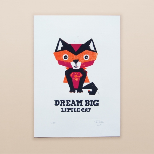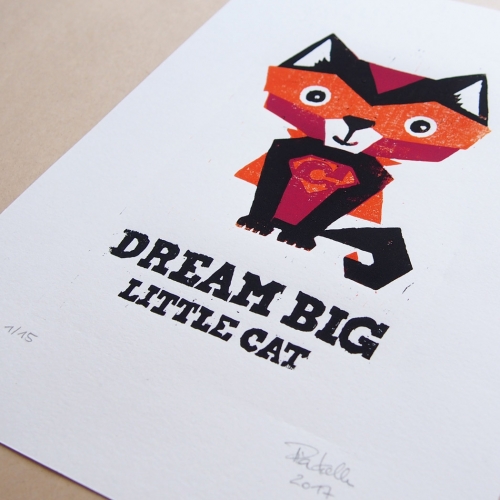 The little cat is a superhero! A great children’s room motif for brave boys and girls who have big dreams. The handmade woodcut print is a wonderful wall decoration in the baby and children’s room.