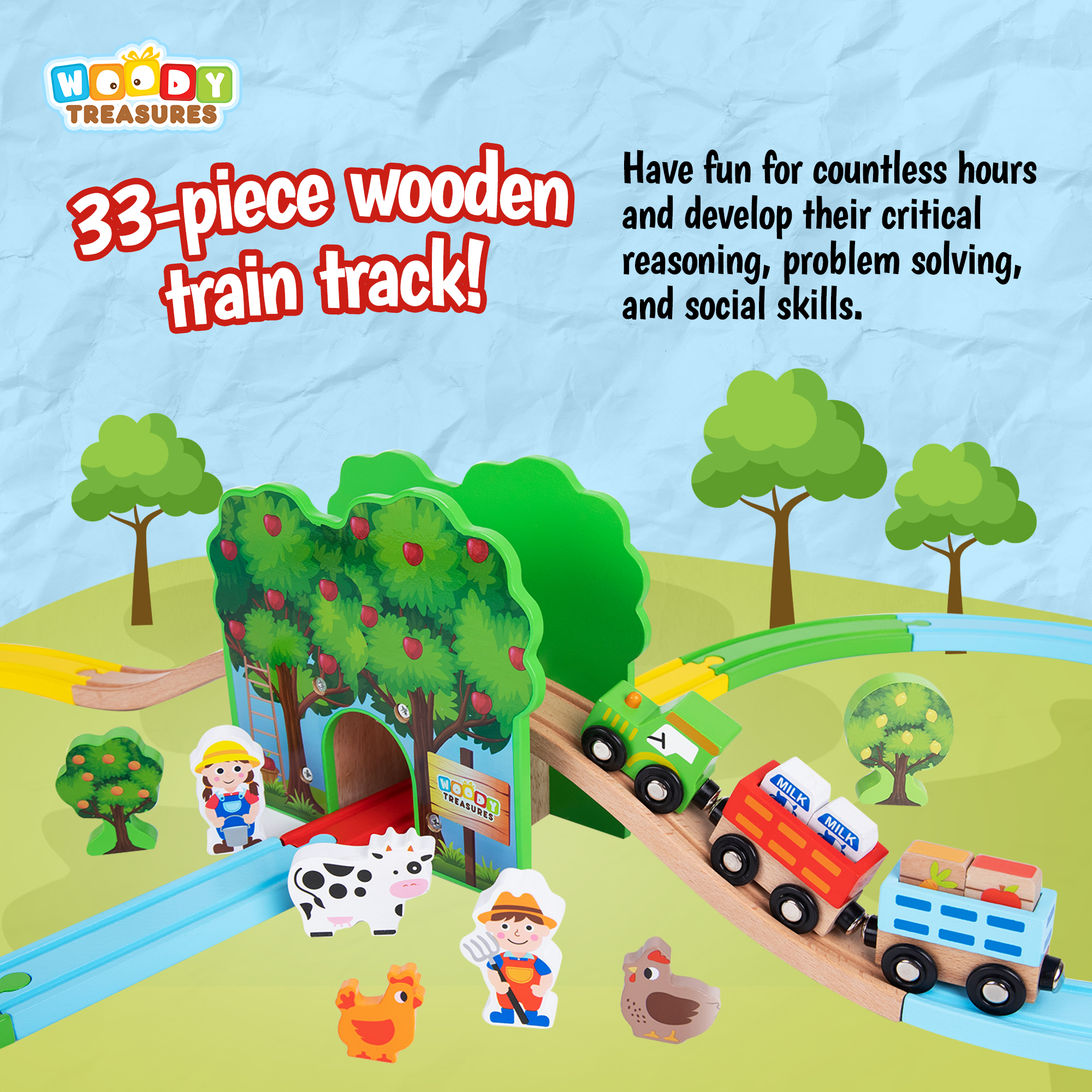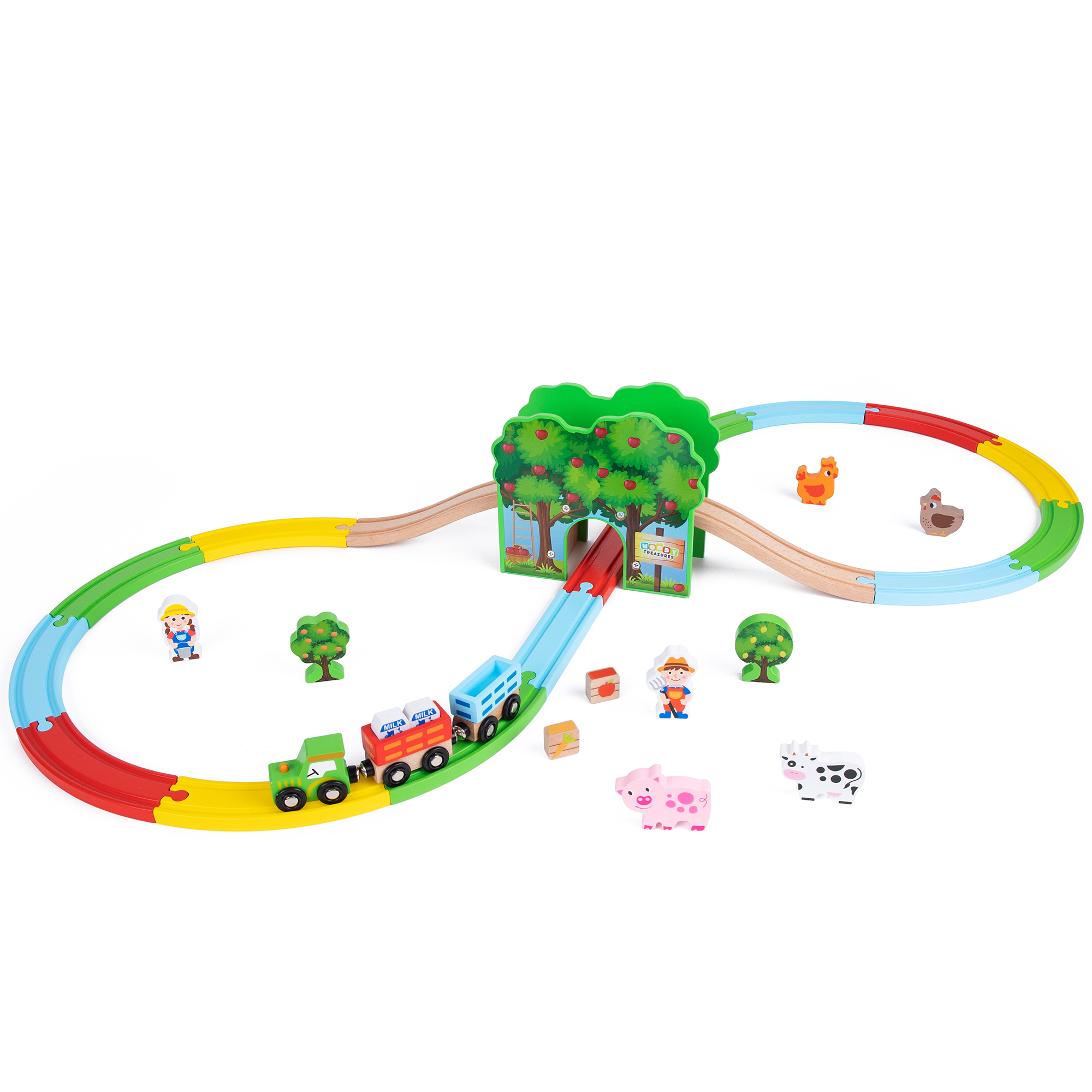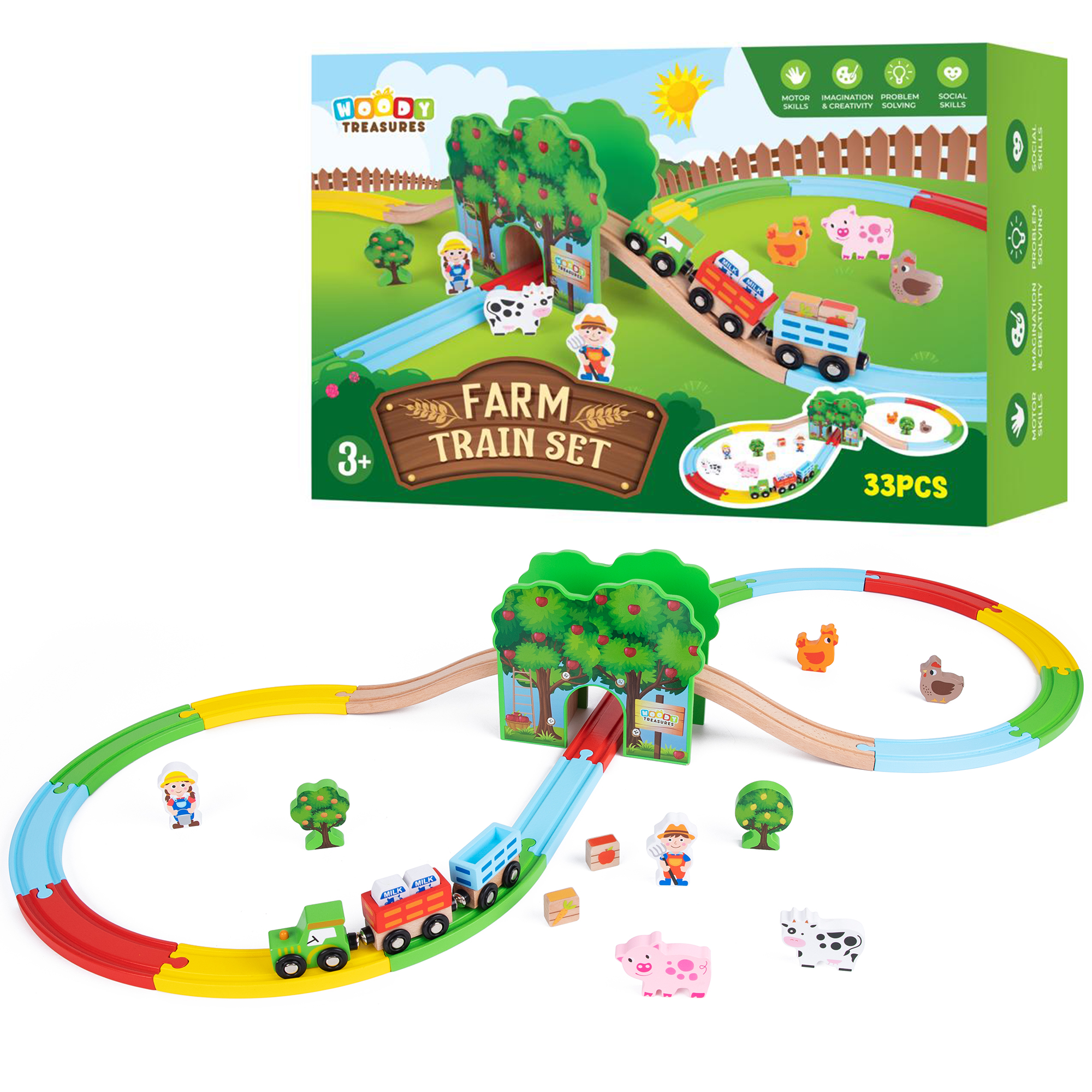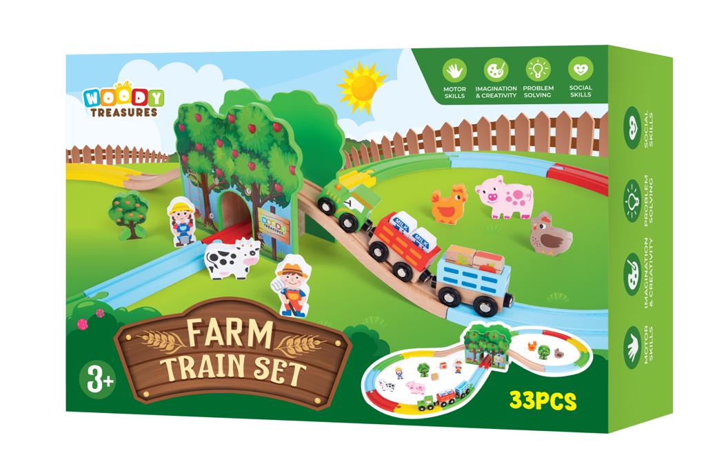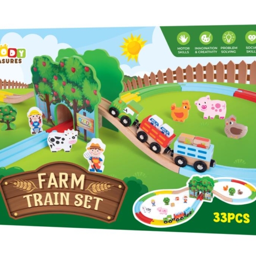 There’s nothing as fun as a wooden farm, delightful animals- and all the fun that comes with this farm set! Your child is the farmer, and the all-around “big boss” as they expand their imagination and explore in and around the farm. This fun farmhouse expands their imagination to play- and enjoy- and play some more! Usable as a standalone toy, or for even more fun, together with Woody Treasures Train Track Set children train and improve their fine motor skills while having a blast