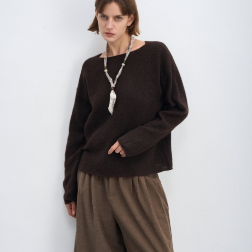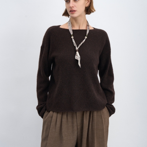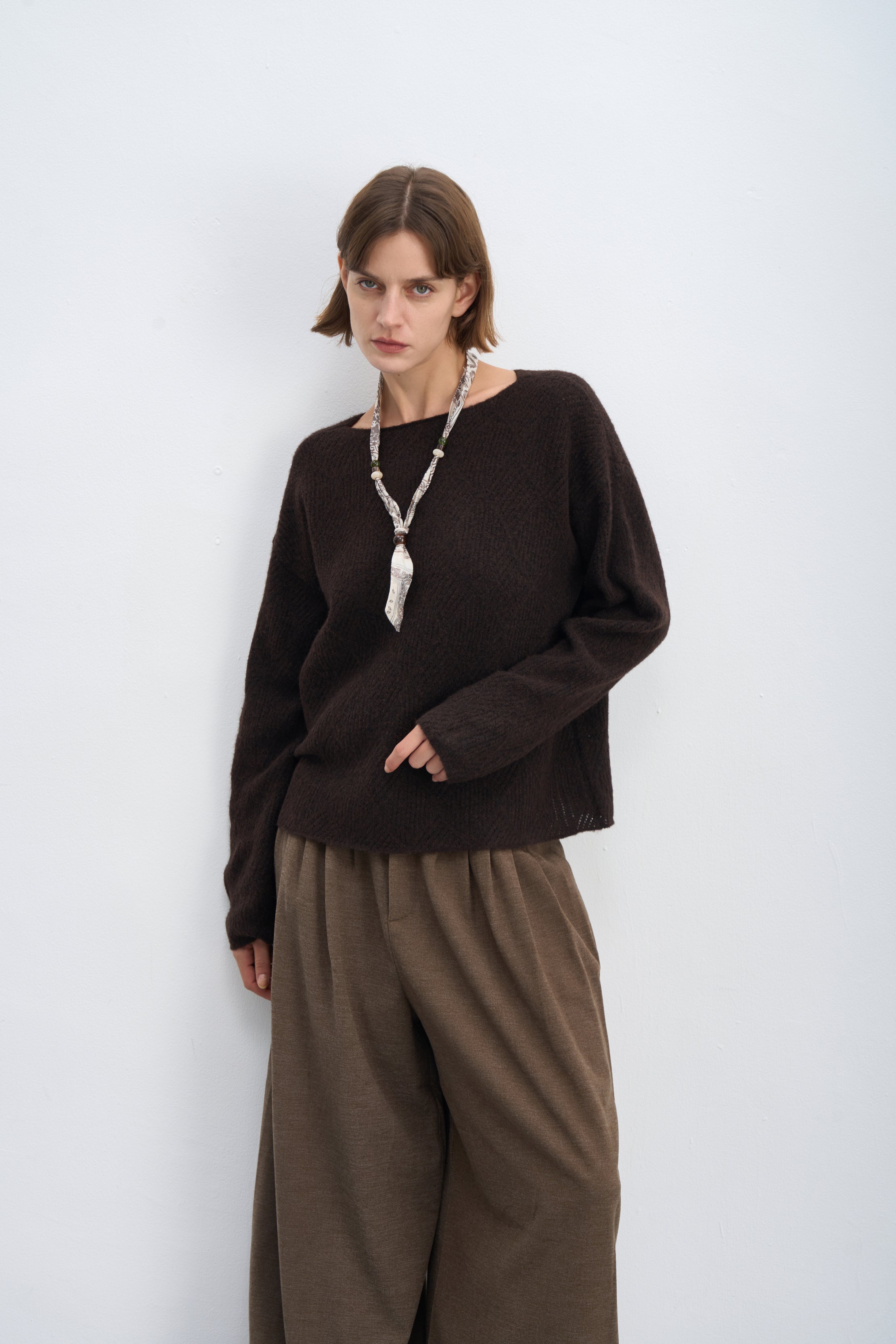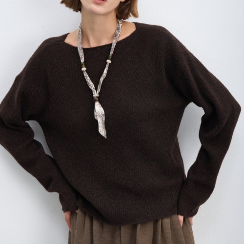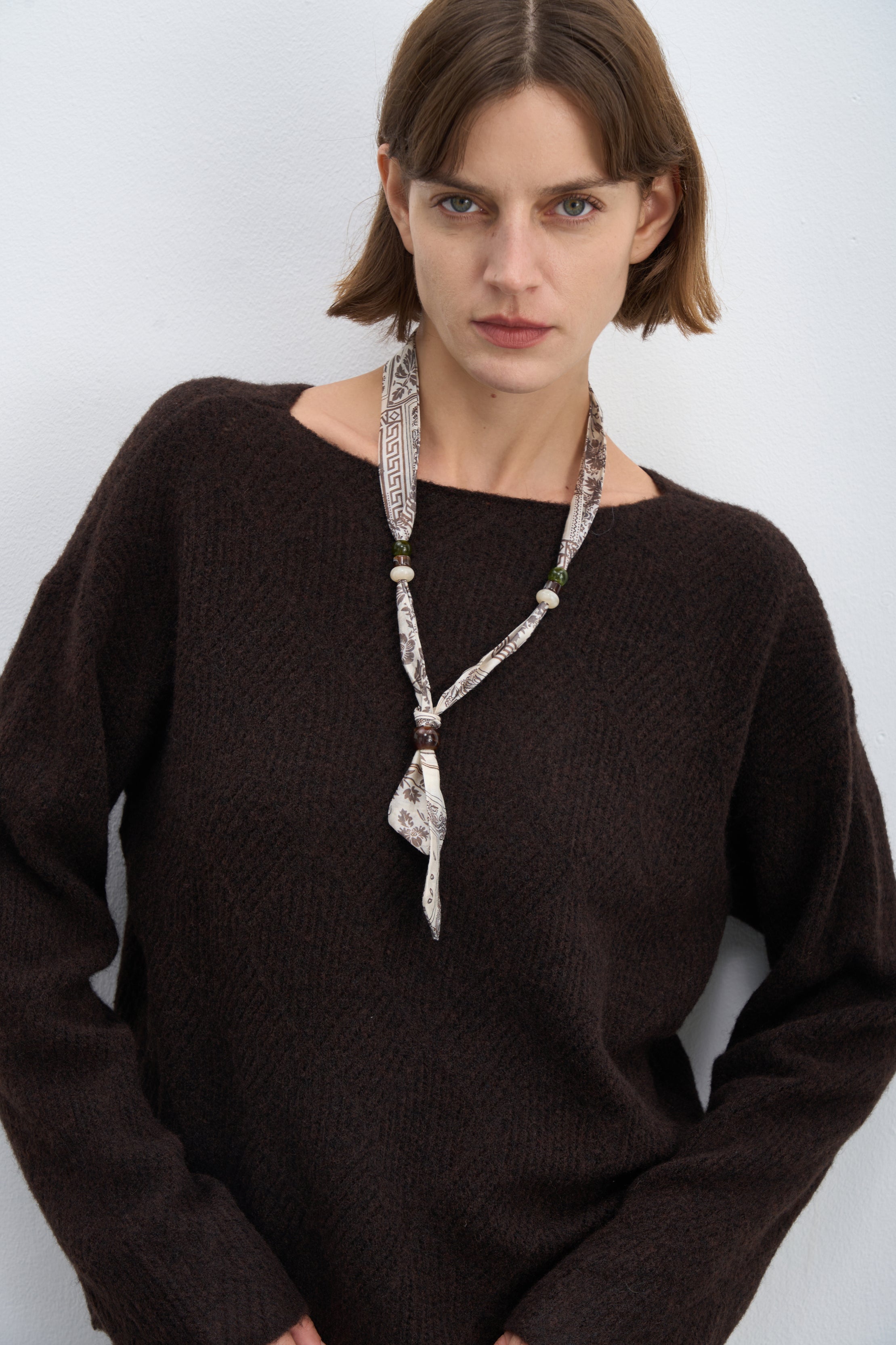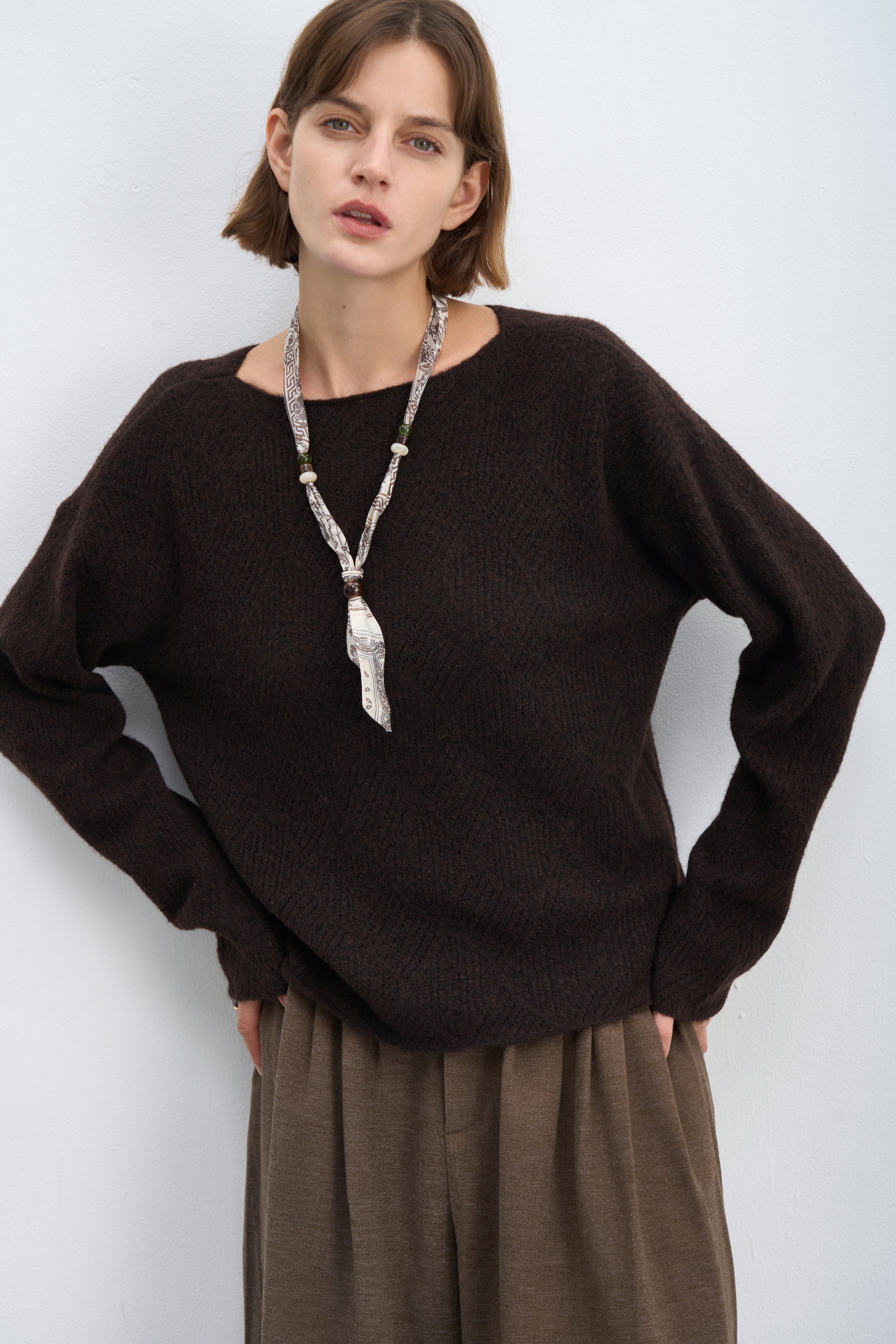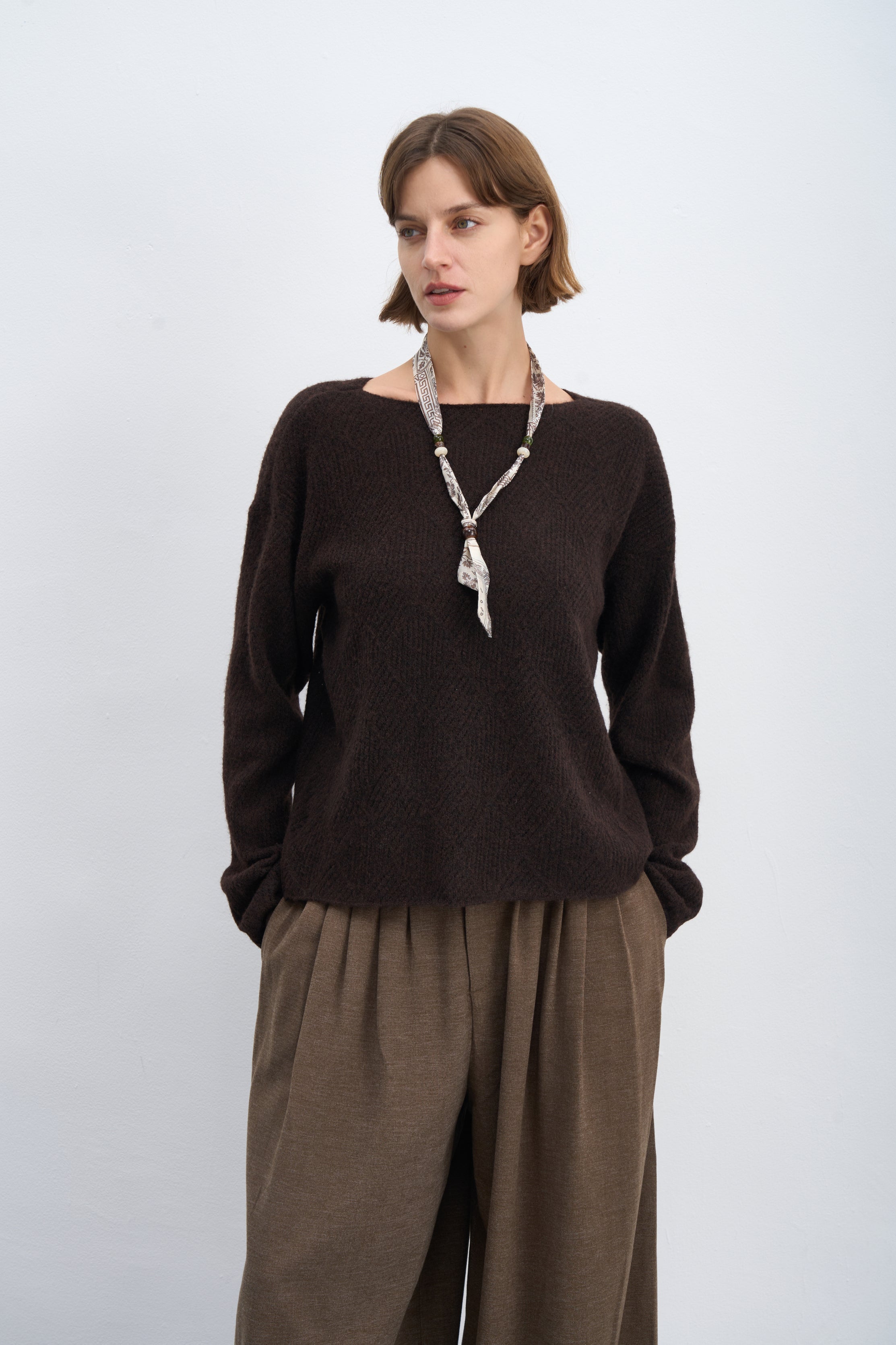 Textured Elegance, Effortless Warmth The Wool-Alpaca Blend Scarf Diamond-Pattern Openwork Sweater combines minimalist sophistication with subtle texture. Its crinkle finish and openwork design create a refined, layered look that’s both timeless and contemporary. Luxurious Warmth in Every Detail Crafted from a premium wool-alpaca blend, this sweater delivers lightweight warmth and lasting comfort. The fabric’s structure ensures durability while maintaining a soft, skin-friendly feel—perfect for cool-weather layering. Distinctive Scarf Accent Paired with a signature cashew-pattern scarf, it adds a touch of effortless charm and modern flair, elevating your daily ensembles with understated luxury.