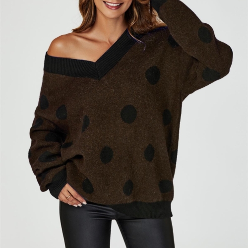 Stay stylish and cosy in this Polka Dot Pattern Wool Blended V-Neck Jumper. Crafted from a soft and warm wool blend, this jumper features a classic V-neck design and a playful polka dot pattern, adding a touch of fun to your wardrobe. Perfect for layering on cooler days, this versatile piece can be dressed up with smart trousers or dressed down with jeans for a casual yet chic look.- Crafted from Soft Knit wool Blend Jumper- Long Sleeves and V neckline design- Oversized relaxed fit make it the perfect winter layer UK sizeOneSize 8/10/12/14/16MeasurementsModel wears: UK 8/ EU 36/ US 4Model’s height: 175cm/ 5’8” Composition90% Acrylic, 10% Wool