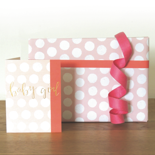 A soft pink wrap with splodgy white spots, perfect for a new baby’s present but cool enough to work for anyone else too.