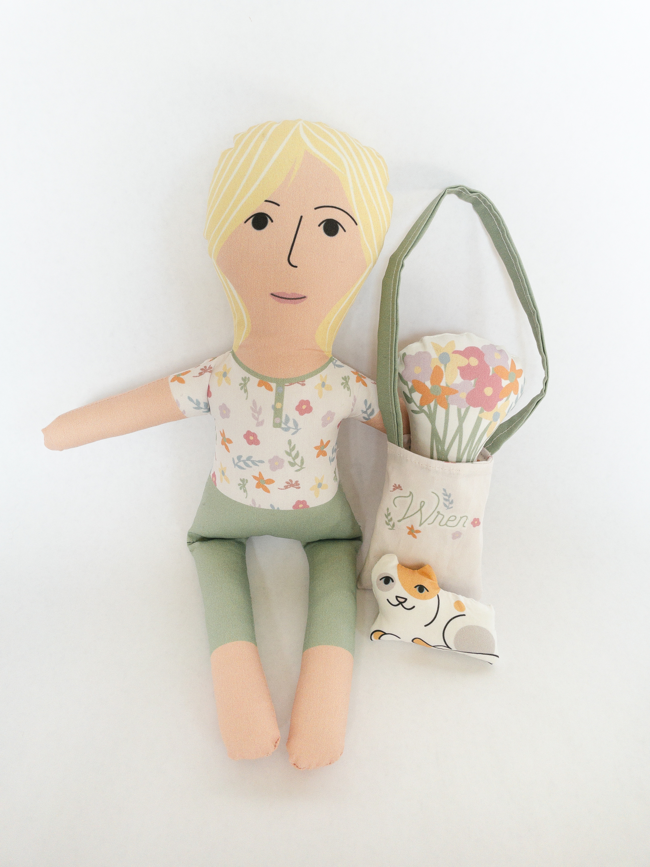 Everything you need to create Wren, a cat, a bouquet of flowers, and a doll-size tote bag.
