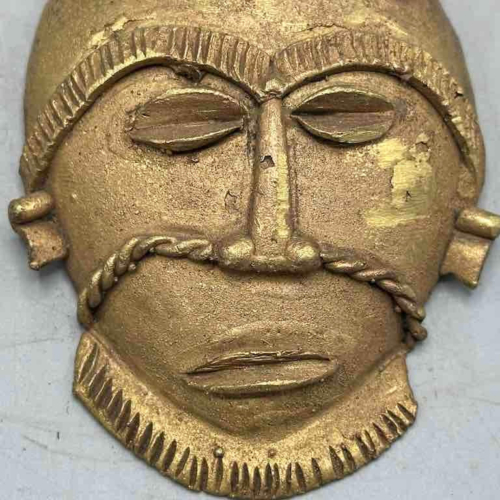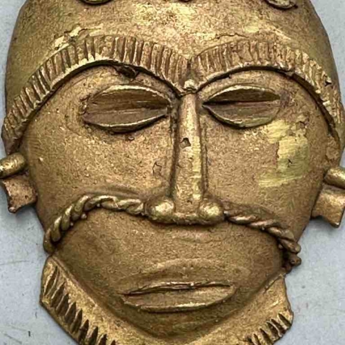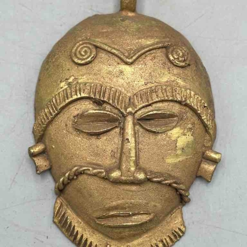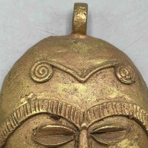 Contemporary African brass mask with loop on the top, allowing it be hung or worn as a pendant on a necklace. This pendant was made by the ancient traditional lost wax casting process where the object is first shaped of bees wax then covered with a sand & clay investment. This unit is dried and then baked so the investment hardens and the wax runs out leaving the space into which the molten brass is poured. Once cooled the investment is removed, broken off, never able to be used again, to yield the object so cast. Every single object of this type, no matter how small, is made this same way, one by one, by hand. As a result no two are identical; each manifests its own particularities: shape, size, casting details, metal characteristics. This mask measures: 4 1/4 x 3 3/4 x 1″ (11 x 9.5 x 2.5 cm)