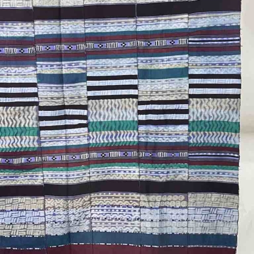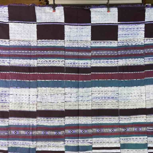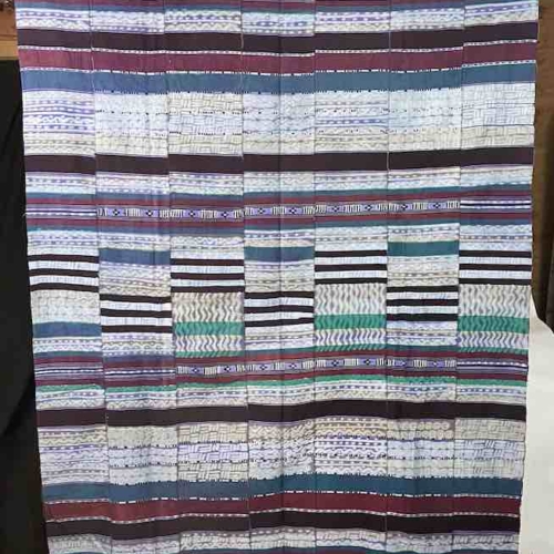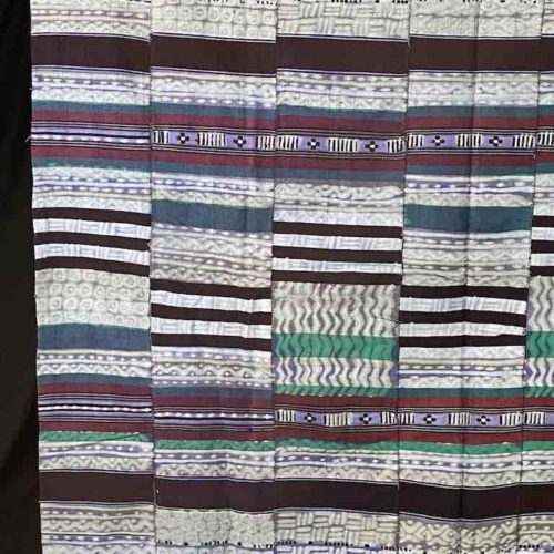These extraordinary, contemporary handwoven, hand-dyed cotton textiles are an innovative modification of 2 traditional well-known Malian tribal textile techniques: The mudcloth fabric dying technique and the colorful narrow band double heddle dragstone loom weaving of the Fulani people of Mali (also known as Peulh). Quite large, these are used as blankets in Africa but for Western use they are more useful as tabletop, a modified bedspread or a gorgeous wall tapestry. This textile measures 83 x 50″ (211 x 127 cm)