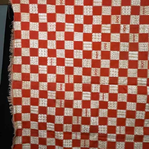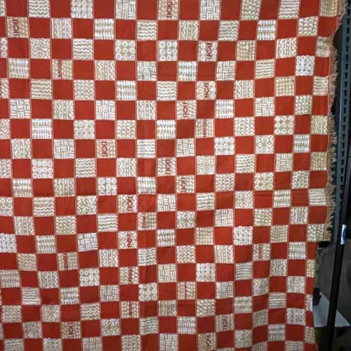 These extraordinary, contemporary handwoven, hand-dyed cotton textiles are an innovative modification of 2 traditional well-known Malian tribal textile techniques: The mudcloth fabric dying technique and the colorful narrow band double heddle dragstone loom weaving of the Fulani people of Mali (also known as Peulh). Quite large, these are used as blankets in Africa but for Western use they are more useful as tabletop, a modified bedspread or a gorgeous wall tapestry. This textile measures 92 x 52″ (234 x 132 cm)