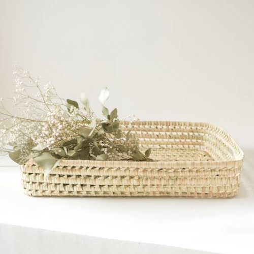 Dimensions: approximately 60 cm x 40 cm. Height: 8 to 10 cm.Authentic Moroccan Craftsmanship.This spacious palm leaf tray is perfect for adorning your coffee table, ideal for holding magazines or serving dishes!