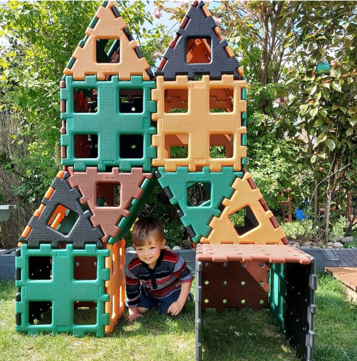 Ideal for classrooms of children to build towers, houses and tunnels. Teaches shape and space through play. This 36 piece set contains 24 squares (in 2 designs) and 12 equilateral triangles in 4 natural colours. Build large outdoor constructions such as a castle, tower or tunnel. Children will be able to build large constructions, whilst all the time learning about shape, 2 and 3 dimensional objects, texture, team-work and role play. They will work together to put their ideas into reality. The pieces easily slot together to create sturdy structures. Lightweight and safe to use. 4 times the size of Giant Polydron and also compatible with Giant Polydron which is available on our website. Use indoors or outdoors. Easy to pack away. Square measures 40.5 x 40.5cm (15.94 x 15.94 inches). BPA FREE