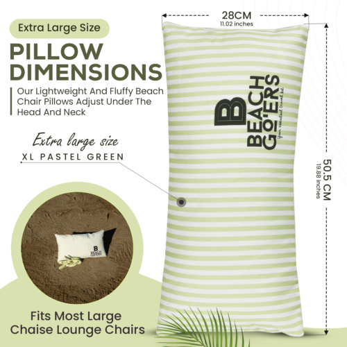 ✈ The XL Beach Chair Pillow is 20″ x 11” (50.8 cm x 27.94 cm) with the strap being able to stretch to 35” (90 cm) long!