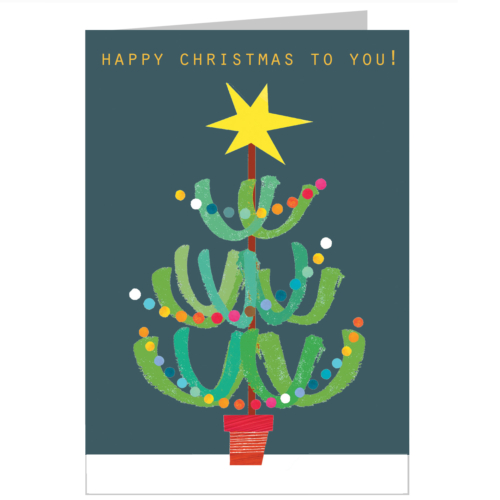 A bold, bright and beautiful Christmas tree on a midnight blue background.