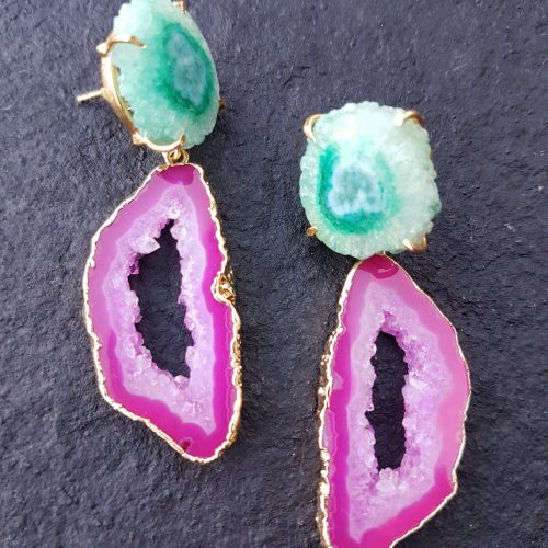 The stunning hues of green and purple / fuchsia pink and white agate semi-precious stone showing its druzy crystals is simply captivating. No two pairs of earrings are exactly the same so each pair of earrings is a real treasure. Colour intensities, shades, marking and sizing varies. Choose between a larger statement pair or a smaller style by adding details to your order notes.