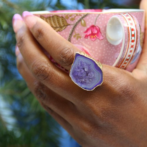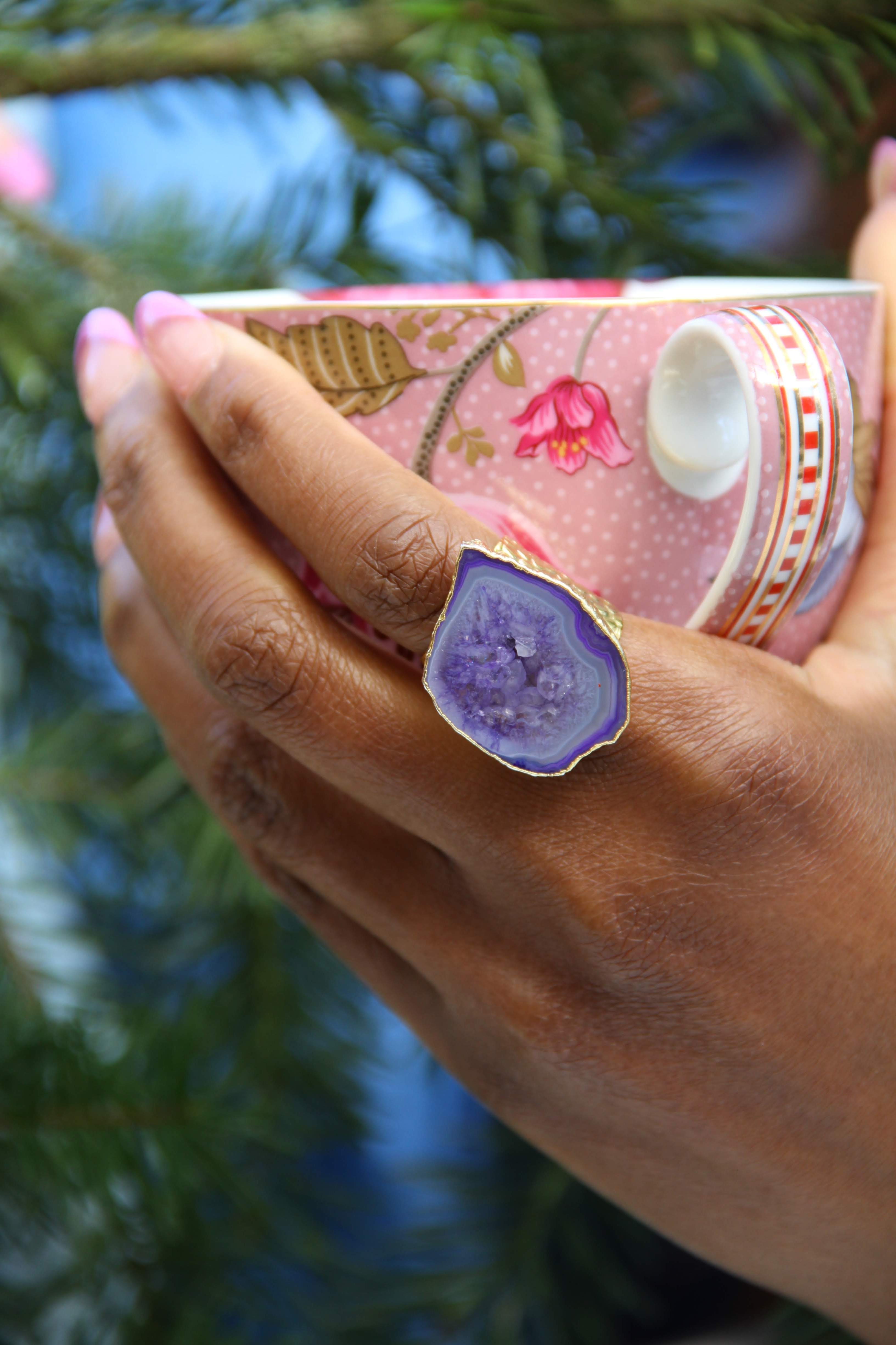 New – Colourful handmade agate crystal gemstone statement rings set in a demi-matt gold plated thick band. Make some power moves with these gorgeously unique rings. The colour intensities, stone sizes and shapes vary from ring to ring making each one unique. Other colours and styles available online and at selected YAA YAA LONDON stockists.