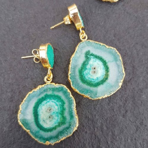 Handmade gorgeous green semi-precious gemstone solar quartz earrings with agate druzy stone and 18k gold plating. Handcrafted and made with love. No two pairs of earrings are exactly the same so each pair of earrings is a real treasure. Colour intensities, shades, marking and sizing varies.