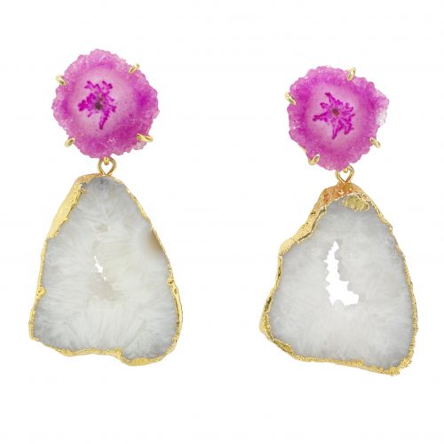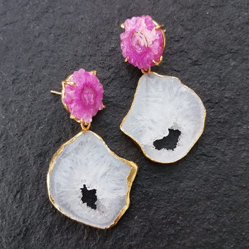 If you are looking for unique handmade earrings, look no further. The stunning pairing of pink/violet solar quartz semi-precious stone with white agate gemstone showing its druzy crystals is simply captivating. No two pairs of earrings are exactly the same so each pair of earrings is a real treasure. Colour intensities, shades, marking and sizing varies.