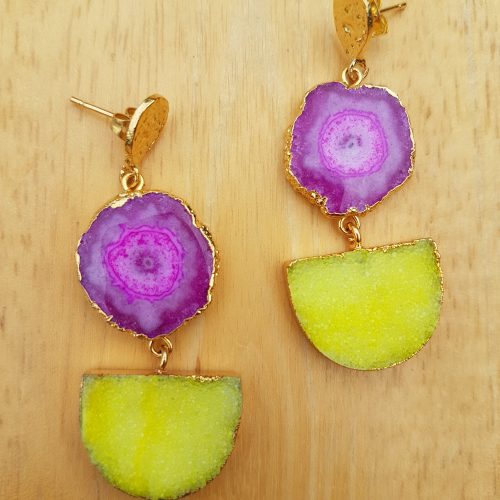 Gorgeous violet solar quartz and lemon yellow druzy agate stone gold drop earrings plated in 24 carat gold. These show stopping earrings are close to my heart and a personal favourite. They will arrive in a YAA YAA LONDON jewellery box making them a great gift idea for yourself or somebody you love. These are earrings are ideal for this season. Stand out from the crowd for all the right reasons with these stunning gemstone accessories.