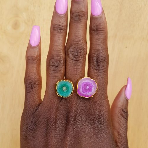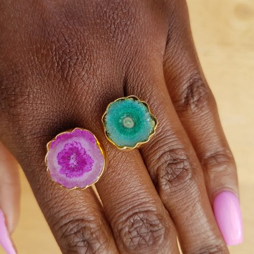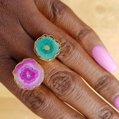 Stunning solar quartz stones set in gold plated brass featuring the coral colourways you asked for. Each ring is unique, handmade, precious and adjustable. Each stone and ring is a unique as the person wearing it and one of a kind.