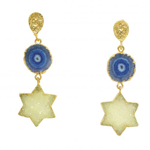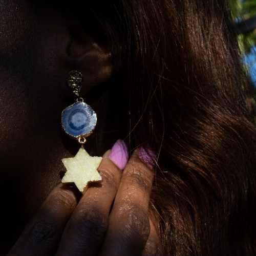 Shimmering like the sky at night. The blue solar quartz is mezmerizing, the druzy stone is inviting – the pairing of the two is out of this world! These earrings are handmade and unique. The beauty of semi precious stones is that each piece is unique! Wear your treasures with confidence. Your earrings will arrive in a YAA YAA LONDON gift box. A great gift idea.