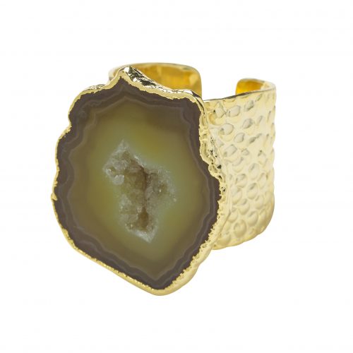 New – Colourful handmade agate crystal gemstone statement rings set in a demi-matt gold plated thick band. Make some power moves with these gorgeously unique rings. The colour intensities, stone sizes and shapes vary from ring to ring making each one unique. Other colours and styles available online and at selected YAA YAA LONDON stockists.