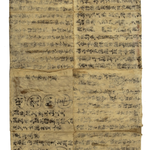 This Yao Shaman ceremonial painting was carefully crafted on mulberry paper in the form of a scroll, taking nearly one to two months to complete. Made from local dyes that were available, the colors of the paintings often closely resemble the colors in the clothing that the Yao people make and wear. This painting is believed to be from the 19th and early 20th centuries, which is a necessary tool used in initiation ceremonies of aspiring priests and shamans. It is believed that shamans and priests act as a gateway between the physical and spiritual worlds. The Yao people originally lived in the southern provinces of China, then migrated south into the mountainous regions of Vietnam. The beautiful artworks offer highly detailed representations people, shamans, and ancestors, and are essential for invoking spirits during ceremonies and for transmitting knowledge between generations. Many shaman ceremonial paintings and artifacts have found new homes in private collections or in museums. This painting measures: 29″ x 16″
