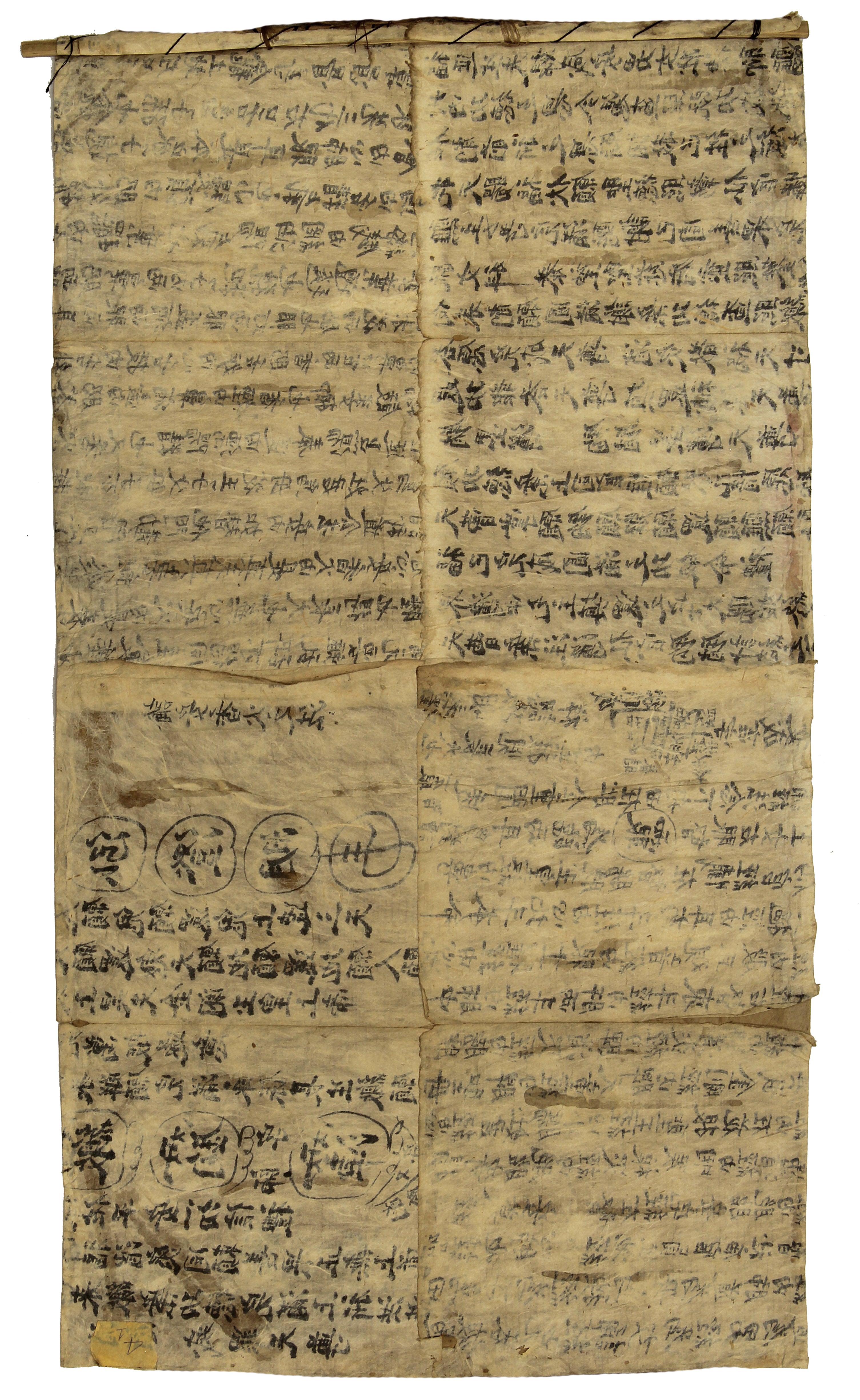 This Yao Shaman ceremonial painting was carefully crafted on mulberry paper in the form of a scroll, taking nearly one to two months to complete. Made from local dyes that were available, the colors of the paintings often closely resemble the colors in the clothing that the Yao people make and wear. This painting is believed to be from the 19th and early 20th centuries, which is a necessary tool used in initiation ceremonies of aspiring priests and shamans. It is believed that shamans and priests act as a gateway between the physical and spiritual worlds. The Yao people originally lived in the southern provinces of China, then migrated south into the mountainous regions of Vietnam. The beautiful artworks offer highly detailed representations people, shamans, and ancestors, and are essential for invoking spirits during ceremonies and for transmitting knowledge between generations. Many shaman ceremonial paintings and artifacts have found new homes in private collections or in museums. This painting measures: 29″ x 16″