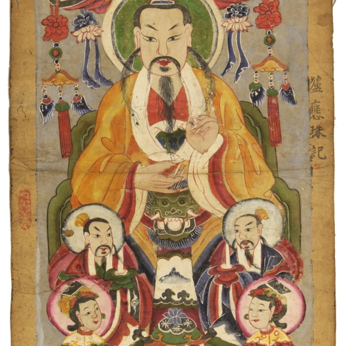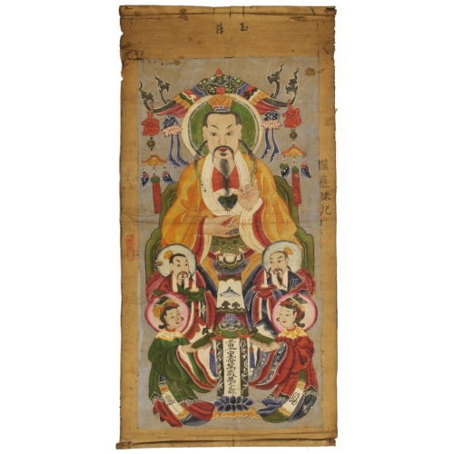 This Yao Shaman ceremonial painting was carefully crafted on mulberry paper in the form of a scroll, taking nearly one to two months to complete. Made from local dyes that were available, the colors of the paintings often closely resemble the colors in the clothing that the Yao people make and wear. This painting is believed to be from the 19th and early 20th centuries, which is a necessary tool used in initiation ceremonies of aspiring priests and shamans. It is believed that shamans and priests act as a gateway between the physical and spiritual worlds. The Yao people originally lived in the southern provinces of China, then migrated south into the mountainous regions of Vietnam. The beautiful artworks offer highly detailed representations people, shamans, and ancestors, and are essential for invoking spirits during ceremonies and for transmitting knowledge between generations. Many shaman ceremonial paintings and artifacts have found new homes in private collections or in museums. This painting measures: 36″ x 18″