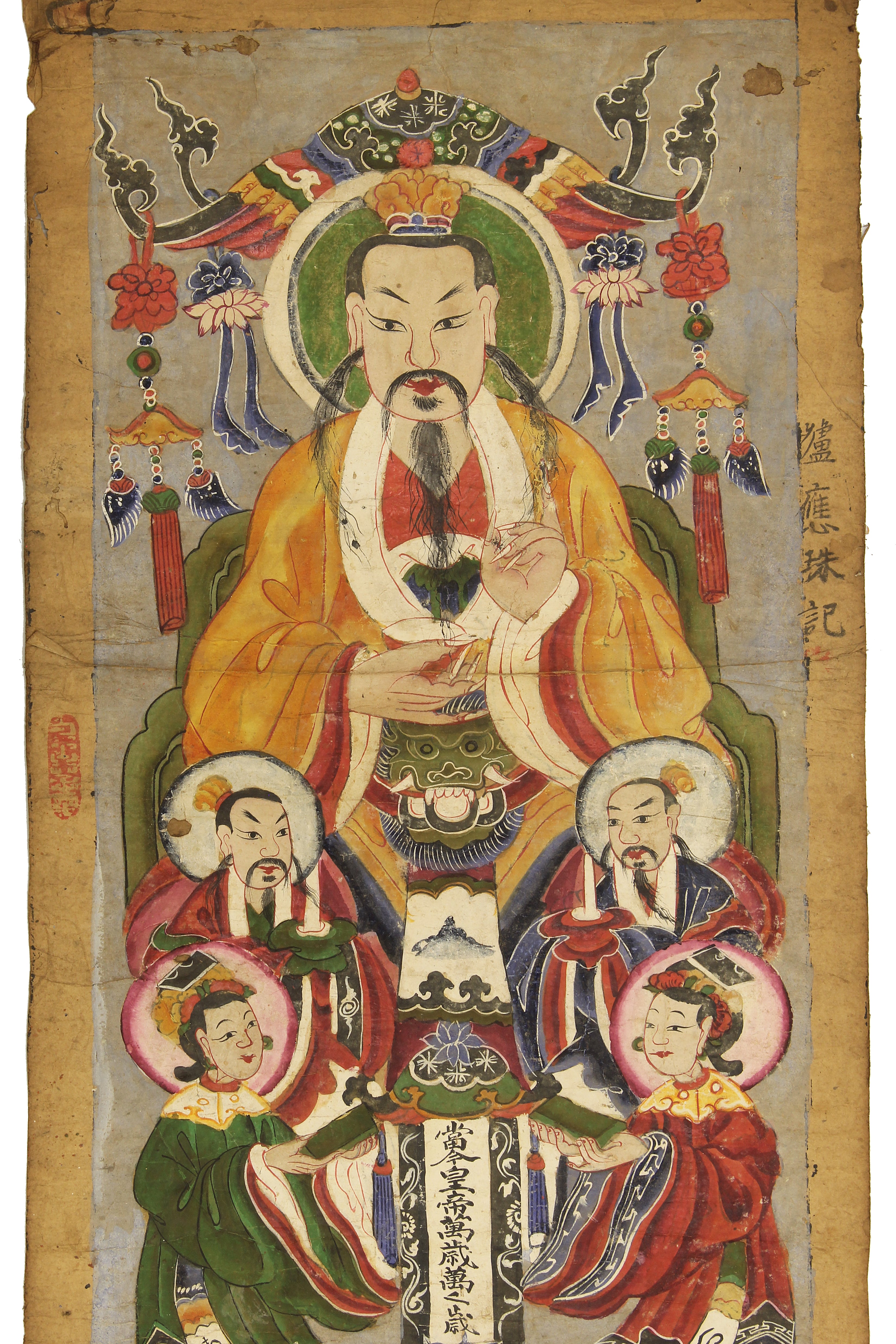 This Yao Shaman ceremonial painting was carefully crafted on mulberry paper in the form of a scroll, taking nearly one to two months to complete. Made from local dyes that were available, the colors of the paintings often closely resemble the colors in the clothing that the Yao people make and wear. This painting is believed to be from the 19th and early 20th centuries, which is a necessary tool used in initiation ceremonies of aspiring priests and shamans. It is believed that shamans and priests act as a gateway between the physical and spiritual worlds. The Yao people originally lived in the southern provinces of China, then migrated south into the mountainous regions of Vietnam. The beautiful artworks offer highly detailed representations people, shamans, and ancestors, and are essential for invoking spirits during ceremonies and for transmitting knowledge between generations. Many shaman ceremonial paintings and artifacts have found new homes in private collections or in museums. This painting measures: 36″ x 18″