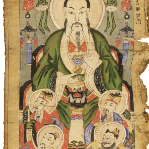 This Yao Shaman ceremonial painting was carefully crafted on mulberry paper in the form of a scroll, taking nearly one to two months to complete. Made from local dyes that were available, the colors of the paintings often closely resemble the colors in the clothing that the Yao people make and wear. This painting is believed to be from the 19th and early 20th centuries, which is a necessary tool used in initiation ceremonies of aspiring priests and shamans. It is believed that shamans and priests act as a gateway between the physical and spiritual worlds. The Yao people originally lived in the southern provinces of China, then migrated south into the mountainous regions of Vietnam. The beautiful artworks offer highly detailed representations people, shamans, and ancestors, and are essential for invoking spirits during ceremonies and for transmitting knowledge between generations. Many shaman ceremonial paintings and artifacts have found new homes in private collections or in museums. This painting measures: 37″ x 17″