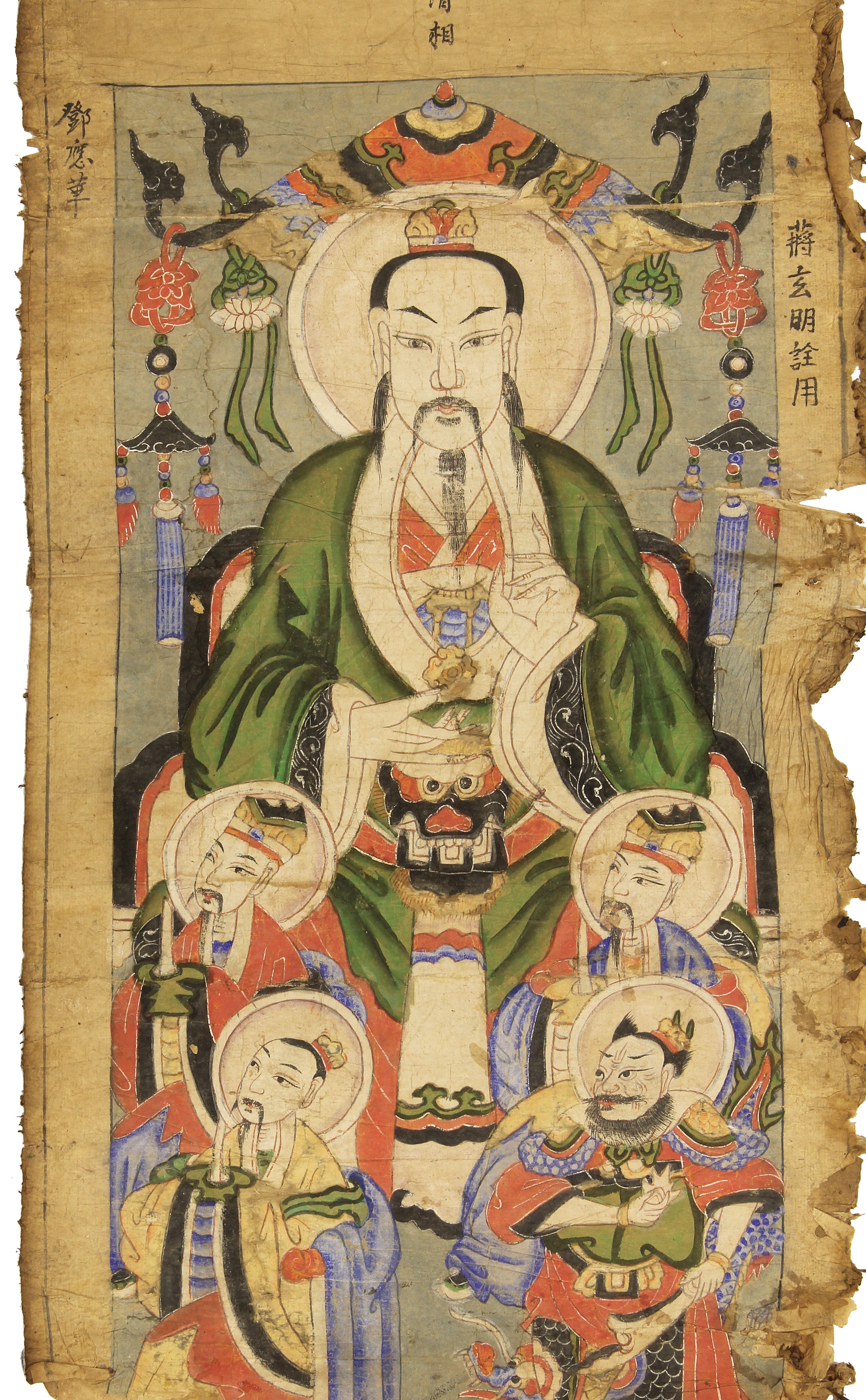 This Yao Shaman ceremonial painting was carefully crafted on mulberry paper in the form of a scroll, taking nearly one to two months to complete. Made from local dyes that were available, the colors of the paintings often closely resemble the colors in the clothing that the Yao people make and wear. This painting is believed to be from the 19th and early 20th centuries, which is a necessary tool used in initiation ceremonies of aspiring priests and shamans. It is believed that shamans and priests act as a gateway between the physical and spiritual worlds. The Yao people originally lived in the southern provinces of China, then migrated south into the mountainous regions of Vietnam. The beautiful artworks offer highly detailed representations people, shamans, and ancestors, and are essential for invoking spirits during ceremonies and for transmitting knowledge between generations. Many shaman ceremonial paintings and artifacts have found new homes in private collections or in museums. This painting measures: 37″ x 17″