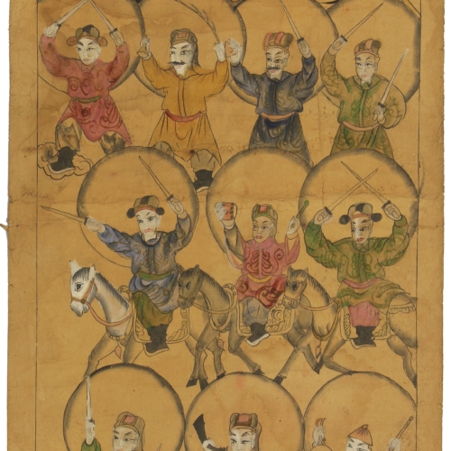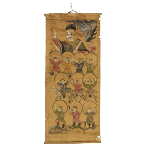 This Yao Shaman ceremonial painting was carefully crafted on mulberry paper in the form of a scroll, taking nearly one to two months to complete. Made from local dyes that were available, the colors of the paintings often closely resemble the colors in the clothing that the Yao people make and wear. This painting is believed to be from the 19th and early 20th centuries, which is a necessary tool used in initiation ceremonies of aspiring priests and shamans. It is believed that shamans and priests act as a gateway between the physical and spiritual worlds. The Yao people originally lived in the southern provinces of China, then migrated south into the mountainous regions of Vietnam. The beautiful artworks offer highly detailed representations people, shamans, and ancestors, and are essential for invoking spirits during ceremonies and for transmitting knowledge between generations. Many shaman ceremonial paintings and artifacts have found new homes in private collections or in museums. This painting measures: 39″ x 16.5″