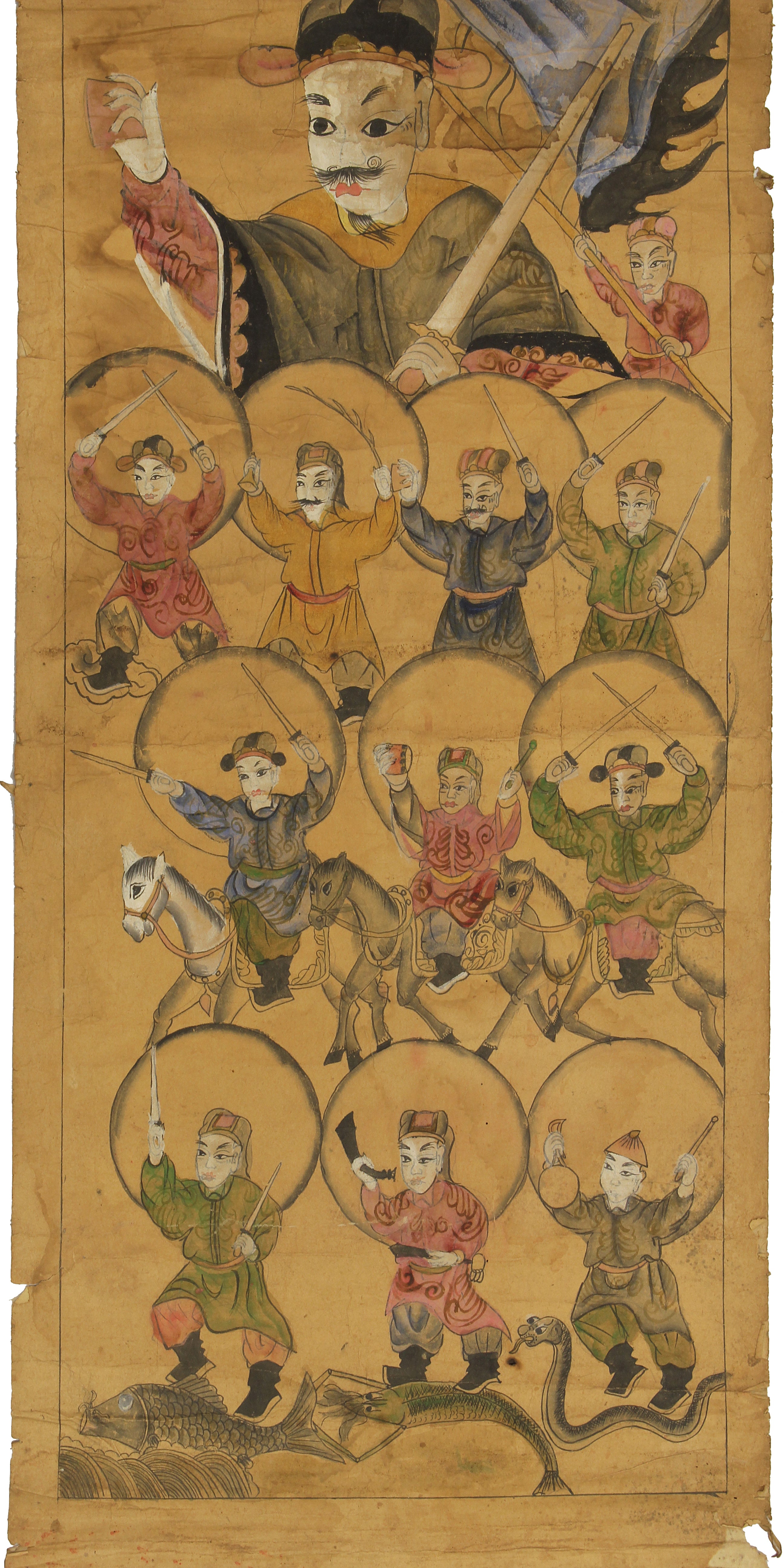 This Yao Shaman ceremonial painting was carefully crafted on mulberry paper in the form of a scroll, taking nearly one to two months to complete. Made from local dyes that were available, the colors of the paintings often closely resemble the colors in the clothing that the Yao people make and wear. This painting is believed to be from the 19th and early 20th centuries, which is a necessary tool used in initiation ceremonies of aspiring priests and shamans. It is believed that shamans and priests act as a gateway between the physical and spiritual worlds. The Yao people originally lived in the southern provinces of China, then migrated south into the mountainous regions of Vietnam. The beautiful artworks offer highly detailed representations people, shamans, and ancestors, and are essential for invoking spirits during ceremonies and for transmitting knowledge between generations. Many shaman ceremonial paintings and artifacts have found new homes in private collections or in museums. This painting measures: 39″ x 16.5″