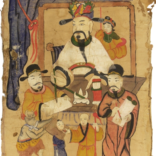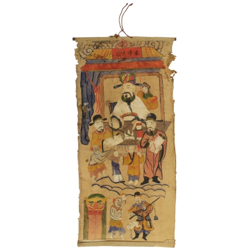 This Yao Shaman ceremonial painting was carefully crafted on mulberry paper in the form of a scroll, taking nearly one to two months to complete. Made from local dyes that were available, the colors of the paintings often closely resemble the colors in the clothing that the Yao people make and wear. This painting is believed to be from the 19th and early 20th centuries, which is a necessary tool used in initiation ceremonies of aspiring priests and shamans. It is believed that shamans and priests act as a gateway between the physical and spiritual worlds. The Yao people originally lived in the southern provinces of China, then migrated south into the mountainous regions of Vietnam. The beautiful artworks offer highly detailed representations people, shamans, and ancestors, and are essential for invoking spirits during ceremonies and for transmitting knowledge between generations. Many shaman ceremonial paintings and artifacts have found new homes in private collections or in museums. This painting measures: 46″ x 21″