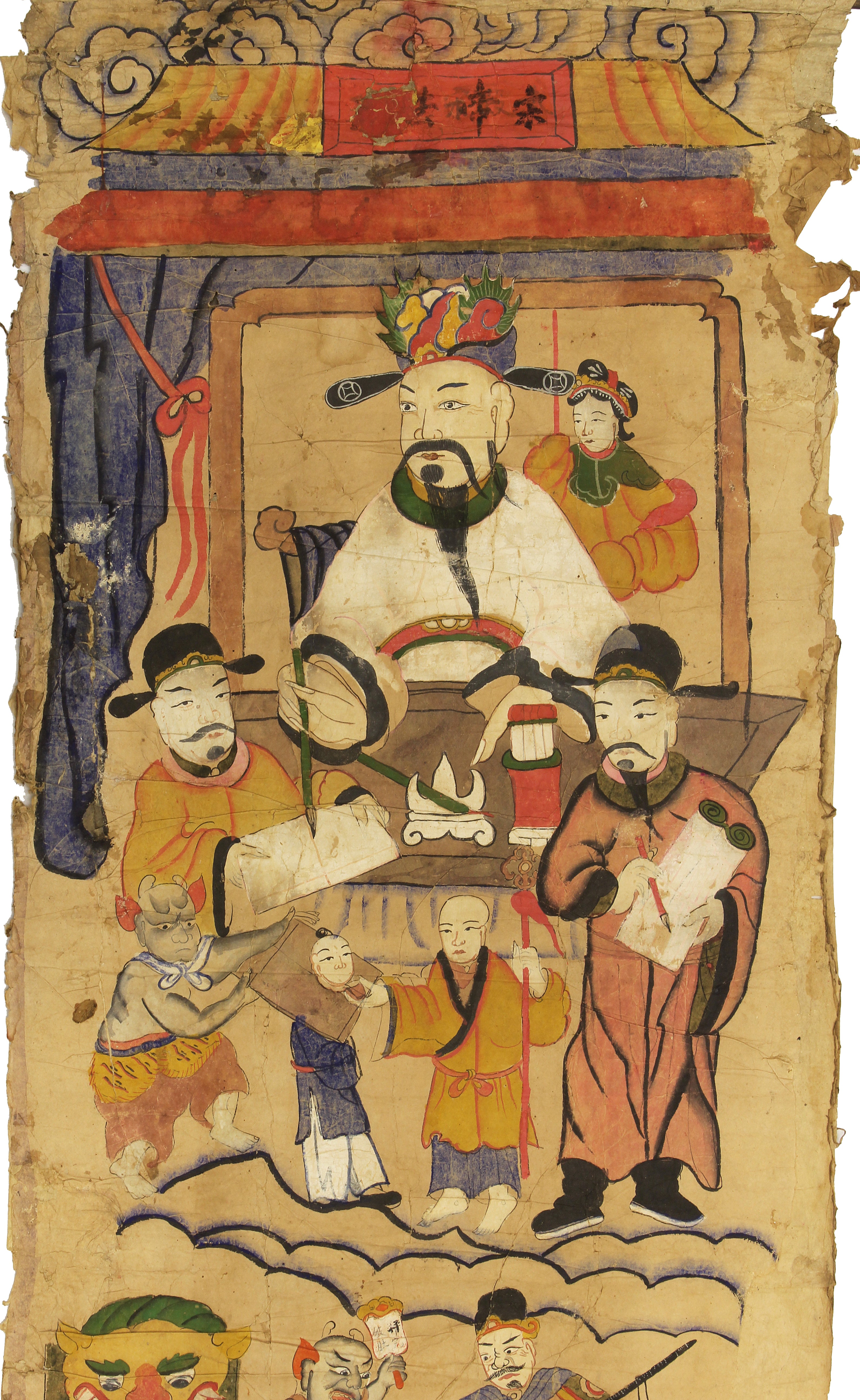 This Yao Shaman ceremonial painting was carefully crafted on mulberry paper in the form of a scroll, taking nearly one to two months to complete. Made from local dyes that were available, the colors of the paintings often closely resemble the colors in the clothing that the Yao people make and wear. This painting is believed to be from the 19th and early 20th centuries, which is a necessary tool used in initiation ceremonies of aspiring priests and shamans. It is believed that shamans and priests act as a gateway between the physical and spiritual worlds. The Yao people originally lived in the southern provinces of China, then migrated south into the mountainous regions of Vietnam. The beautiful artworks offer highly detailed representations people, shamans, and ancestors, and are essential for invoking spirits during ceremonies and for transmitting knowledge between generations. Many shaman ceremonial paintings and artifacts have found new homes in private collections or in museums. This painting measures: 46″ x 21″