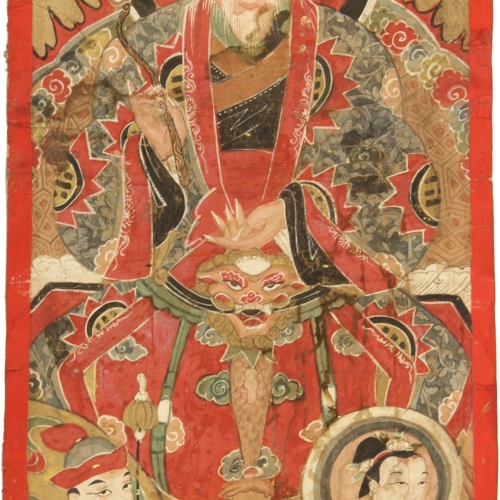 This Yao Shaman ceremonial painting was carefully crafted on mulberry paper in the form of a scroll, taking nearly one to two months to complete. Made from local dyes that were available, the colors of the paintings often closely resemble the colors in the clothing that the Yao people make and wear. This painting is believed to be from the 19th and early 20th centuries, which is a necessary tool used in initiation ceremonies of aspiring priests and shamans. It is believed that shamans and priests act as a gateway between the physical and spiritual worlds. The Yao people originally lived in the southern provinces of China, then migrated south into the mountainous regions of Vietnam. The beautiful artworks offer highly detailed representations people, shamans, and ancestors, and are essential for invoking spirits during ceremonies and for transmitting knowledge between generations. Many shaman ceremonial paintings and artifacts have found new homes in private collections or in museums. This painting measures: 47″ x 18″