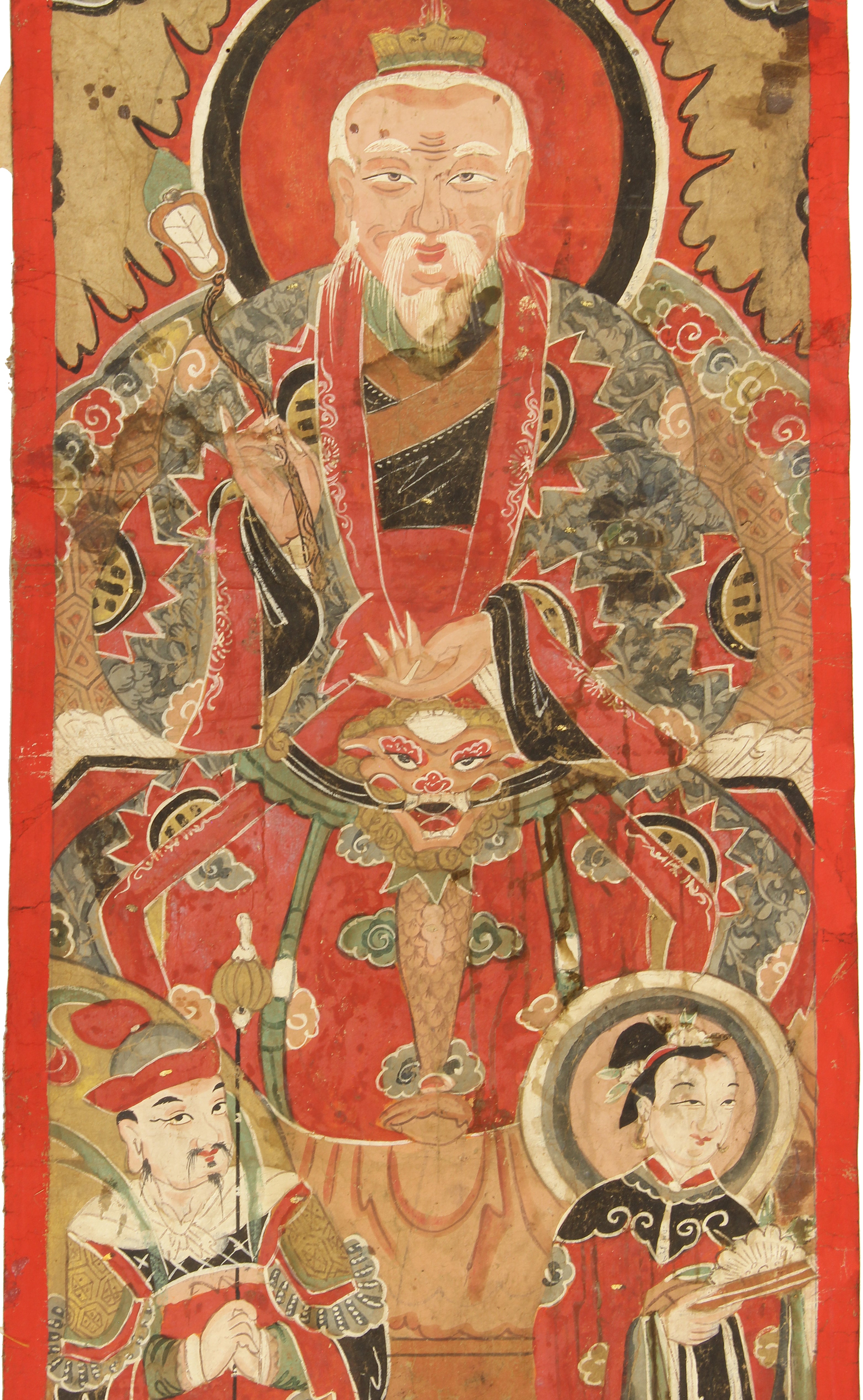 This Yao Shaman ceremonial painting was carefully crafted on mulberry paper in the form of a scroll, taking nearly one to two months to complete. Made from local dyes that were available, the colors of the paintings often closely resemble the colors in the clothing that the Yao people make and wear. This painting is believed to be from the 19th and early 20th centuries, which is a necessary tool used in initiation ceremonies of aspiring priests and shamans. It is believed that shamans and priests act as a gateway between the physical and spiritual worlds. The Yao people originally lived in the southern provinces of China, then migrated south into the mountainous regions of Vietnam. The beautiful artworks offer highly detailed representations people, shamans, and ancestors, and are essential for invoking spirits during ceremonies and for transmitting knowledge between generations. Many shaman ceremonial paintings and artifacts have found new homes in private collections or in museums. This painting measures: 47″ x 18″