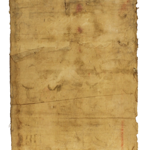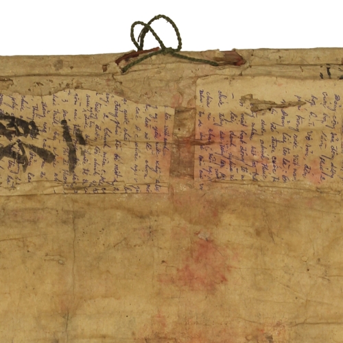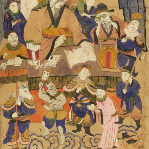 This Yao Shaman ceremonial painting was carefully crafted on mulberry paper in the form of a scroll, taking nearly one to two months to complete. Made from local dyes that were available, the colors of the paintings often closely resemble the colors in the clothing that the Yao people make and wear. This painting is believed to be from the 19th and early 20th centuries, which is a necessary tool used in initiation ceremonies of aspiring priests and shamans. It is believed that shamans and priests act as a gateway between the physical and spiritual worlds. The Yao people originally lived in the southern provinces of China, then migrated south into the mountainous regions of Vietnam. The beautiful artworks offer highly detailed representations people, shamans, and ancestors, and are essential for invoking spirits during ceremonies and for transmitting knowledge between generations. Many shaman ceremonial paintings and artifacts have found new homes in private collections or in museums. This painting measures: 48″ x 20.5″
