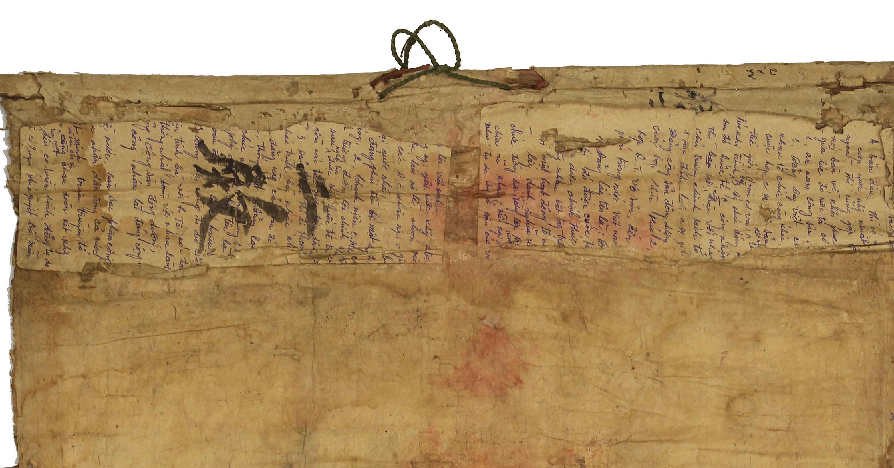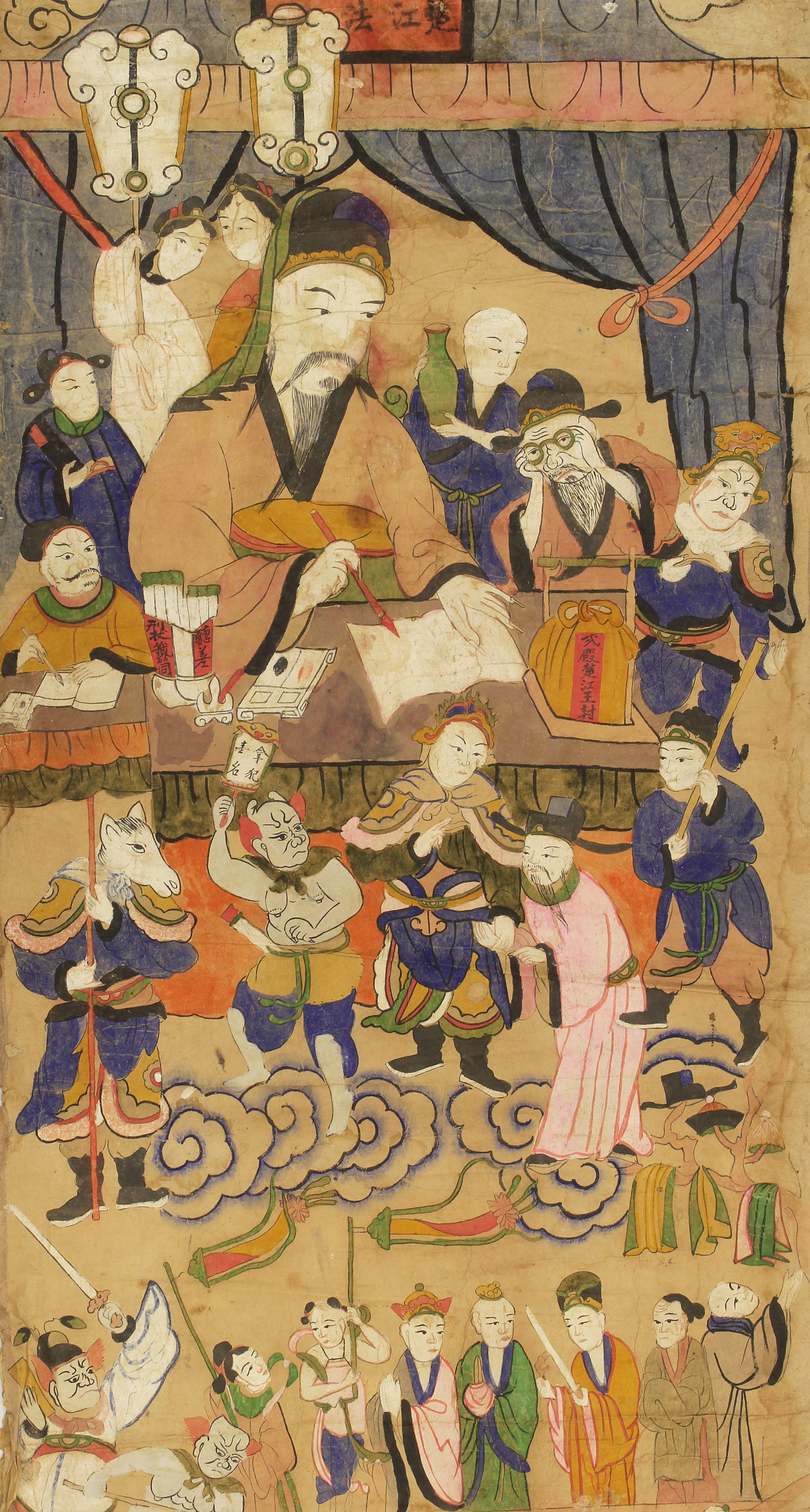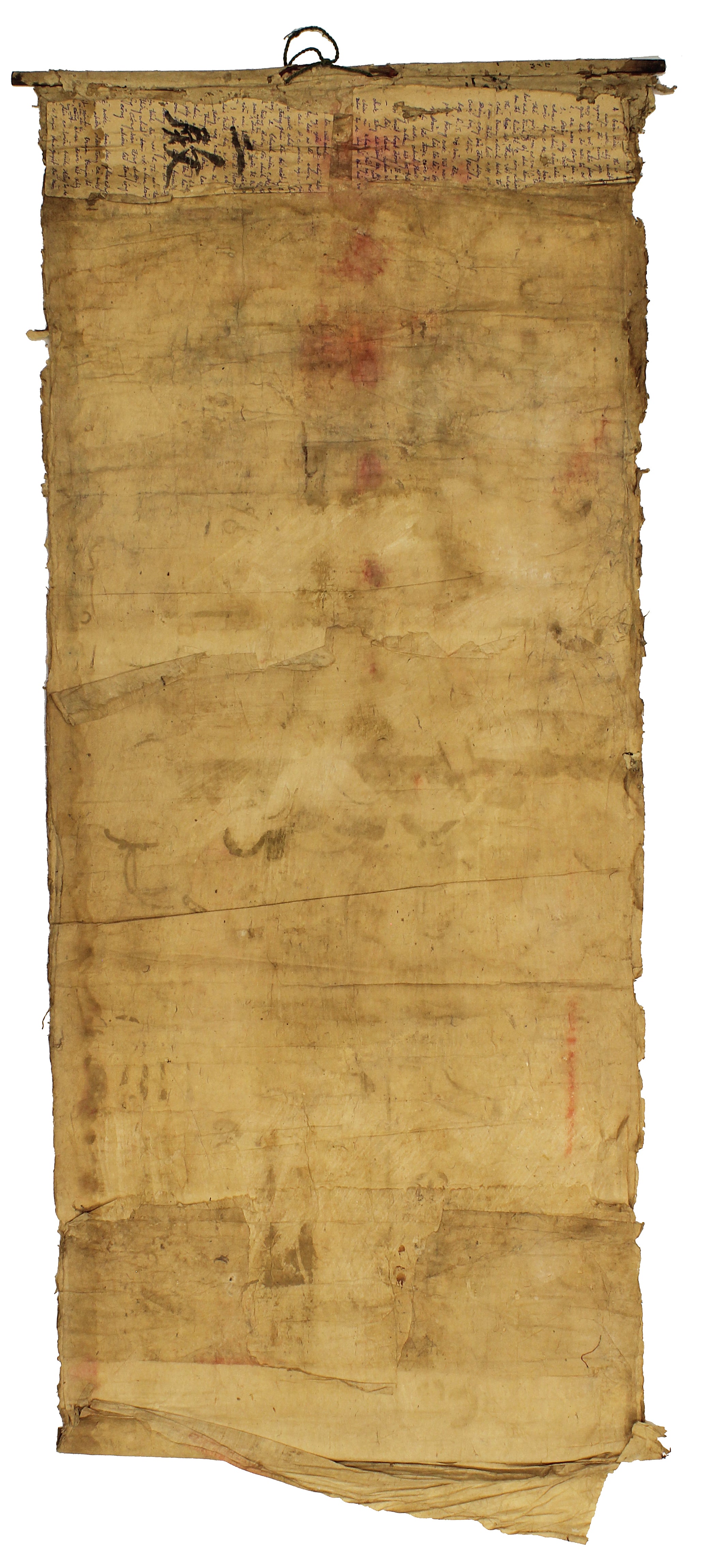 This Yao Shaman ceremonial painting was carefully crafted on mulberry paper in the form of a scroll, taking nearly one to two months to complete. Made from local dyes that were available, the colors of the paintings often closely resemble the colors in the clothing that the Yao people make and wear. This painting is believed to be from the 19th and early 20th centuries, which is a necessary tool used in initiation ceremonies of aspiring priests and shamans. It is believed that shamans and priests act as a gateway between the physical and spiritual worlds. The Yao people originally lived in the southern provinces of China, then migrated south into the mountainous regions of Vietnam. The beautiful artworks offer highly detailed representations people, shamans, and ancestors, and are essential for invoking spirits during ceremonies and for transmitting knowledge between generations. Many shaman ceremonial paintings and artifacts have found new homes in private collections or in museums. This painting measures: 48″ x 20.5″
