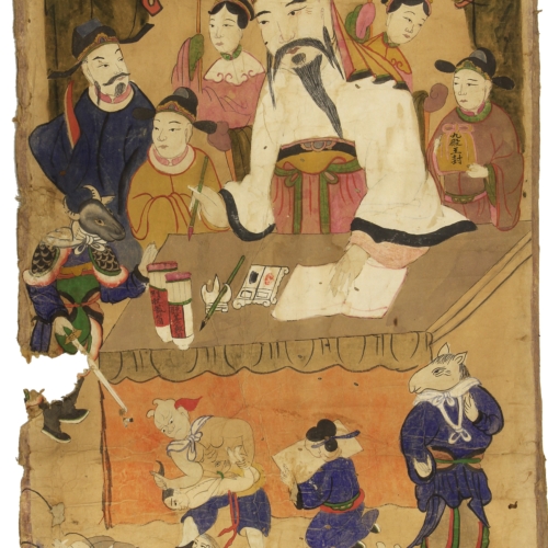 This Yao Shaman ceremonial painting was carefully crafted on mulberry paper in the form of a scroll, taking nearly one to two months to complete. Made from local dyes that were available, the colors of the paintings often closely resemble the colors in the clothing that the Yao people make and wear. This painting is believed to be from the 19th and early 20th centuries, which is a necessary tool used in initiation ceremonies of aspiring priests and shamans. It is believed that shamans and priests act as a gateway between the physical and spiritual worlds. The Yao people originally lived in the southern provinces of China, then migrated south into the mountainous regions of Vietnam. The beautiful artworks offer highly detailed representations people, shamans, and ancestors, and are essential for invoking spirits during ceremonies and for transmitting knowledge between generations. Many shaman ceremonial paintings and artifacts have found new homes in private collections or in museums. This painting measures: 48″ x 21″