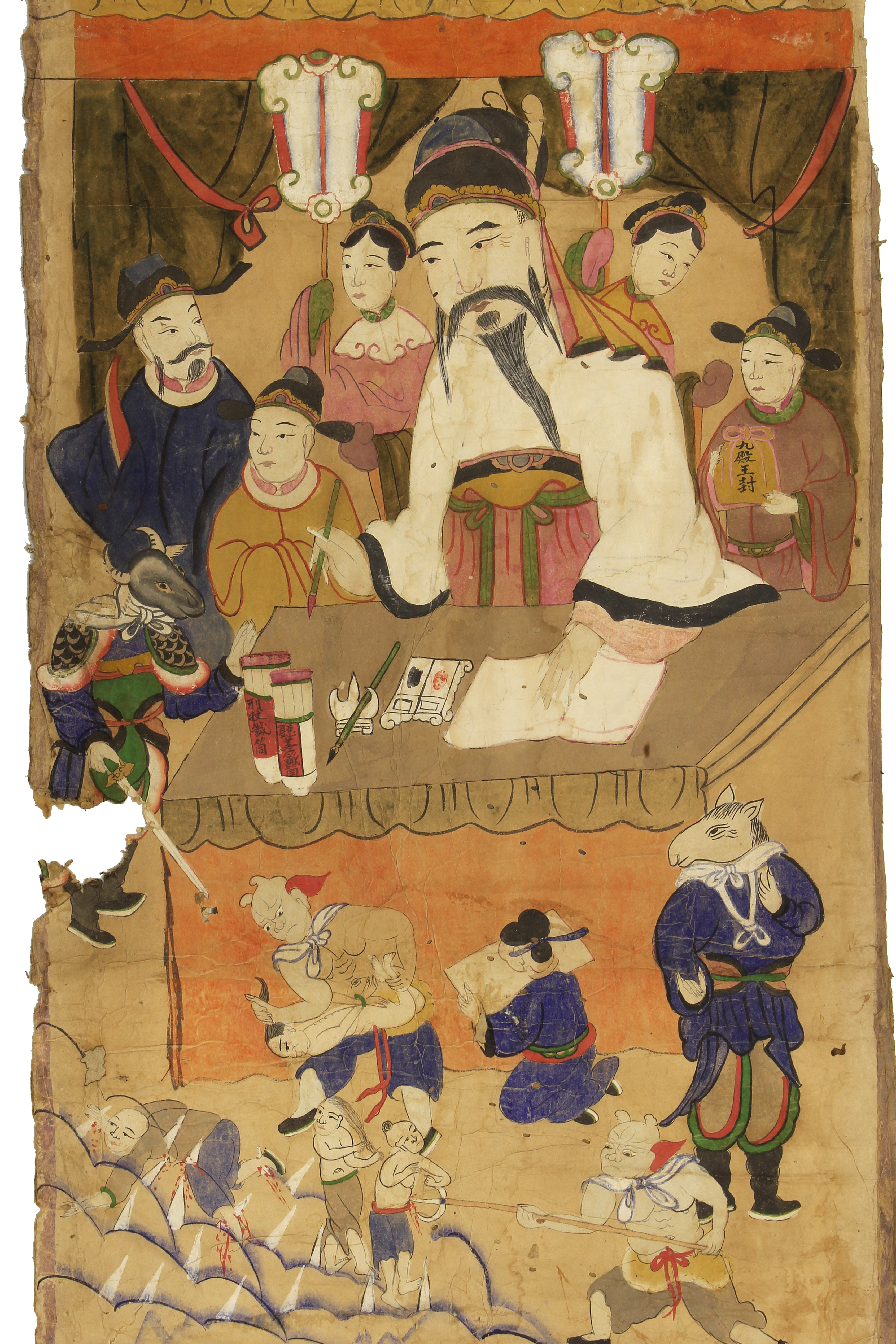 This Yao Shaman ceremonial painting was carefully crafted on mulberry paper in the form of a scroll, taking nearly one to two months to complete. Made from local dyes that were available, the colors of the paintings often closely resemble the colors in the clothing that the Yao people make and wear. This painting is believed to be from the 19th and early 20th centuries, which is a necessary tool used in initiation ceremonies of aspiring priests and shamans. It is believed that shamans and priests act as a gateway between the physical and spiritual worlds. The Yao people originally lived in the southern provinces of China, then migrated south into the mountainous regions of Vietnam. The beautiful artworks offer highly detailed representations people, shamans, and ancestors, and are essential for invoking spirits during ceremonies and for transmitting knowledge between generations. Many shaman ceremonial paintings and artifacts have found new homes in private collections or in museums. This painting measures: 48″ x 21″