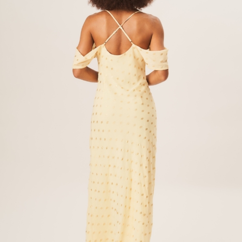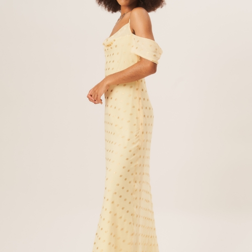 Upgrade your fashion game with our Yellow Cowl Neck Drop Sleeves Foil Maxi Dress. The elegant cowl neck and drop sleeves provide a modern twist, while the yellow color and foil detailing add a touch of glamour. Perfect for making a statement at any event.